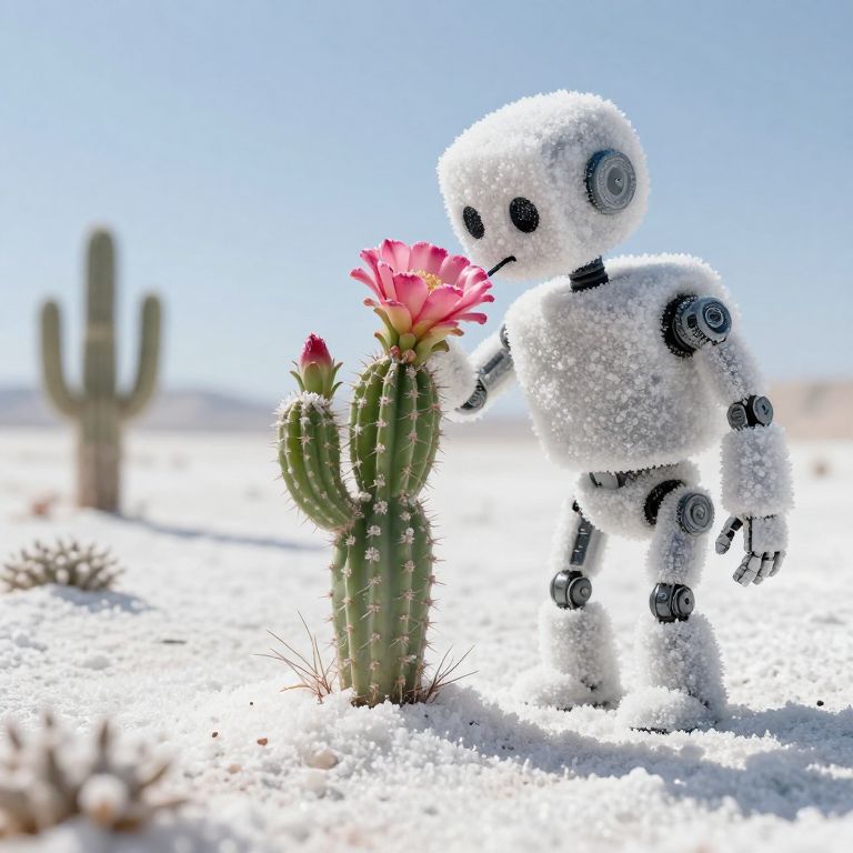 A desert comprised entirely of powdered sugar is traversed by giant, sugar-coated robots sipping nectar from crystallized cactus flowers.