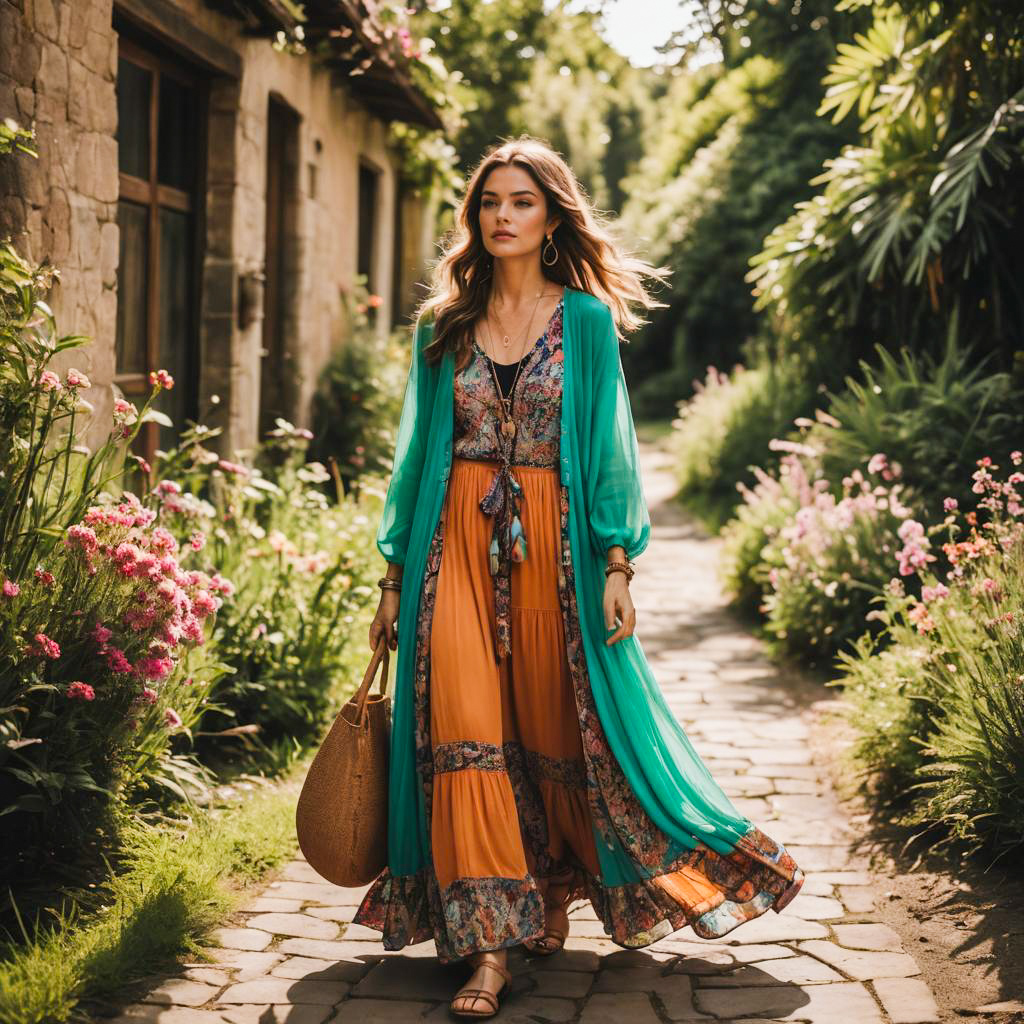 Bohemian Woman in Flowy Maxi Dress and Hat