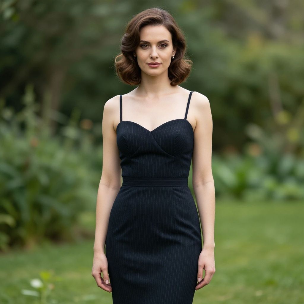 Photograph of a young woman with wavy brown hair, wearing a white polka dot dress, black belt, straw hat, and black heels,