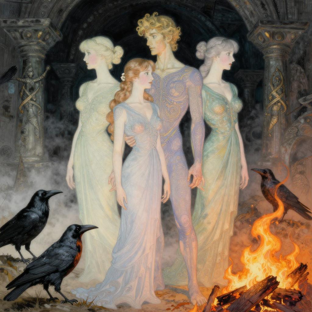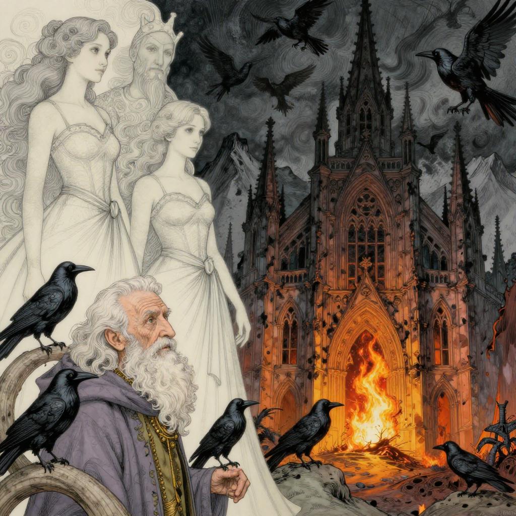 Intricate illustration featuring four ethereal women in flowing, detailed gowns standing amidst a rocky outcrop with numerous black ravens. A dramatic fire burns inside a dark, deserted gothic cathedral in the background. The composition combines delicate linework with bold color and texture, highlighted by pastel elegance and dramatic lighting. The scene evokes a mystical and dark atmosphere with hyper-realistic character detail and expressive poses.