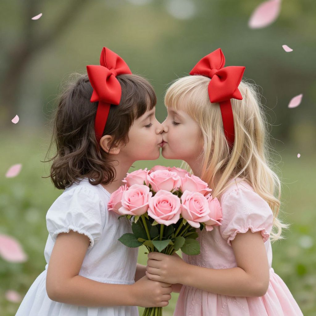 Photograph of two young girls, one with dark brown hair and the other with blonde hair, both wearing large red bows in their hair. They are kissing while the blonde girl holds a bouquet of pink roses. The brunette is in a white dress, and the blonde in a pink dress. Pink petals are floating around them, and the blurred green background suggests an outdoor, garden setting. The image is bright and colorful, capturing a tender, romantic moment between the girls.
