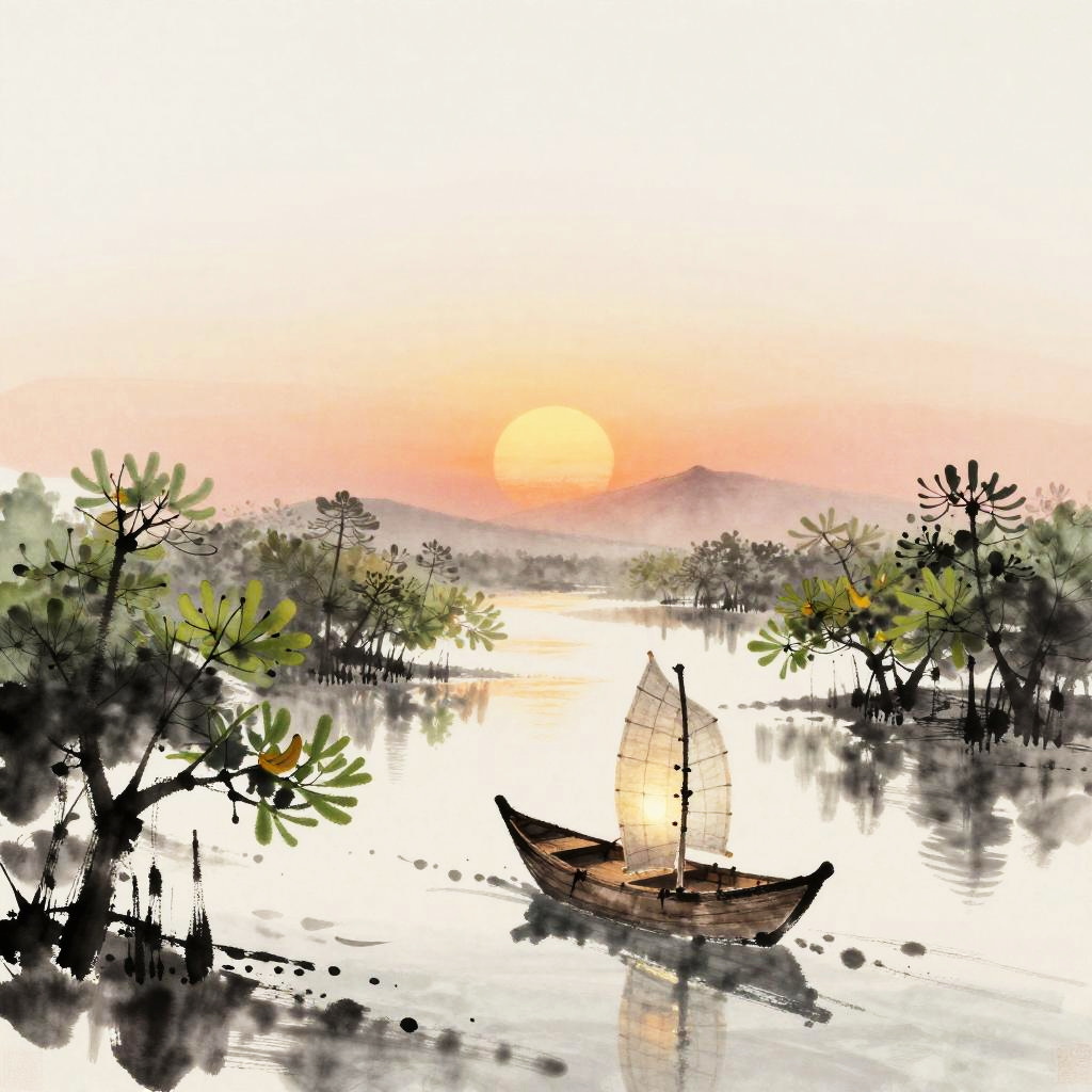 A Minimalist Sumi-e style ink wash painting, illustrating a paper lantern boat sailing into a bioluminescent mangrove estuary at sunset.