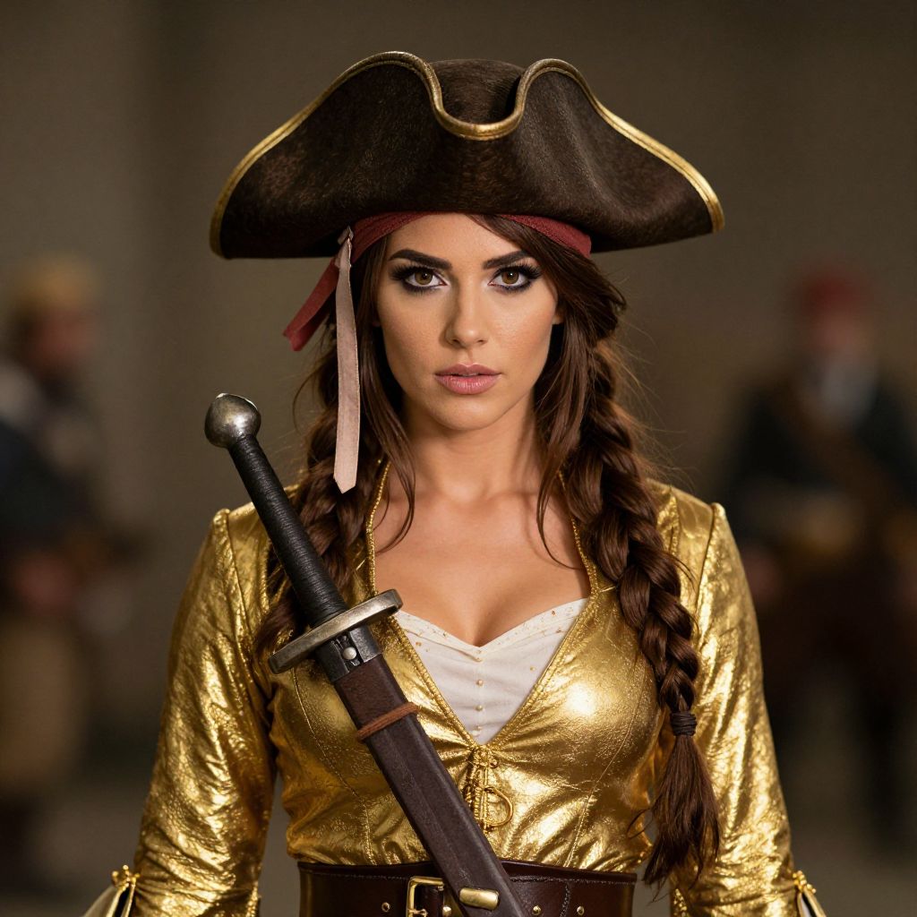Photograph of a woman with long, dark brown braided hair wearing a large, dark brown tricorn hat with a gold trim. She has dark, dramatic makeup with smoky eyes and pink lipstick. She is dressed in a shiny, gold, long-sleeve pirate-style shirt with a white, low-cut undershirt, and has a black sword with a silver hilt strapped to her left side. The background is blurred, showing indistinct figures and a dimly lit, indoor setting. The overall style is reminiscent of a pirate costume, with a focus on rich, contrasting colors and textures.