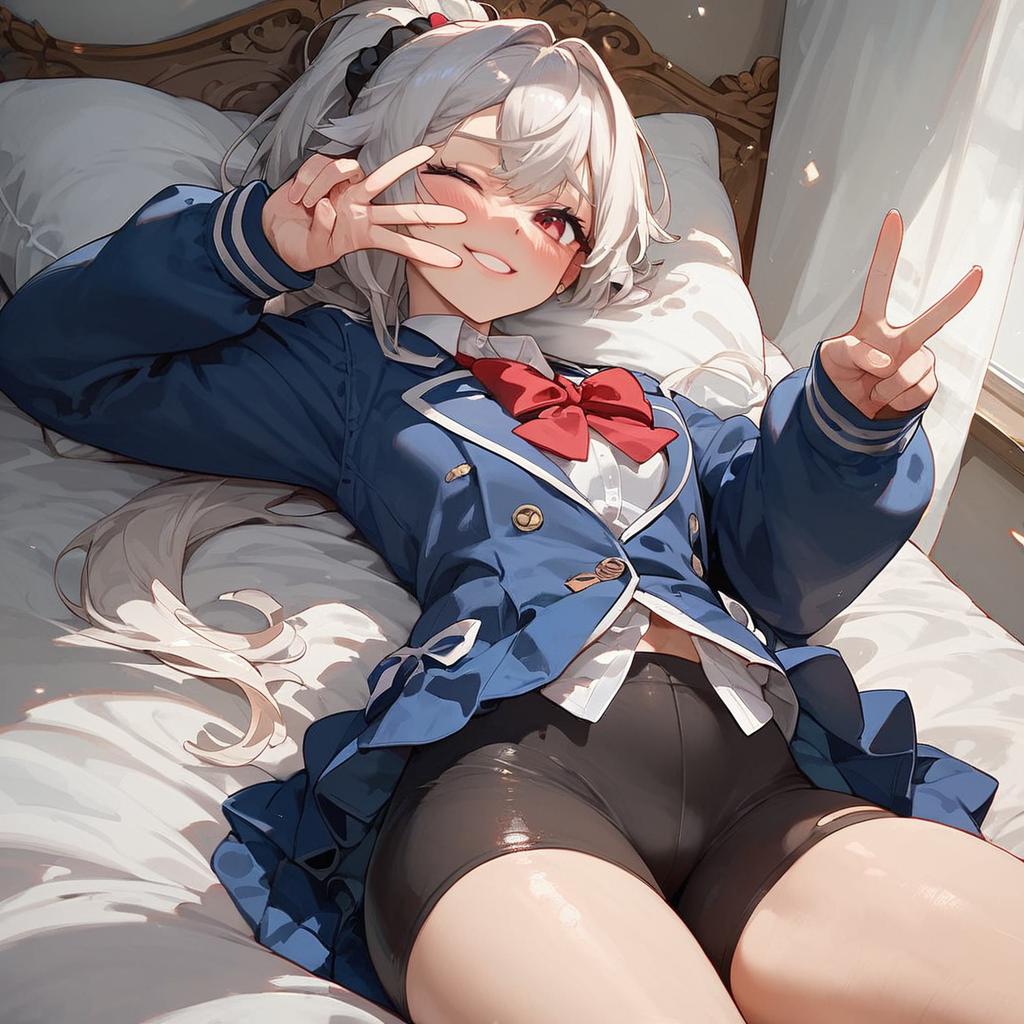 Illustration of a smiling anime girl lying on a bed indoors, looking at the viewer while making peace signs with both hands. She has long white hair tied in a ponytail with a scrunchie, is wearing a blue school jacket with gold buttons, a red bow, a white shirt, and black bike shorts. The setting is a softly lit bedroom with a wooden headboard and white bedding.