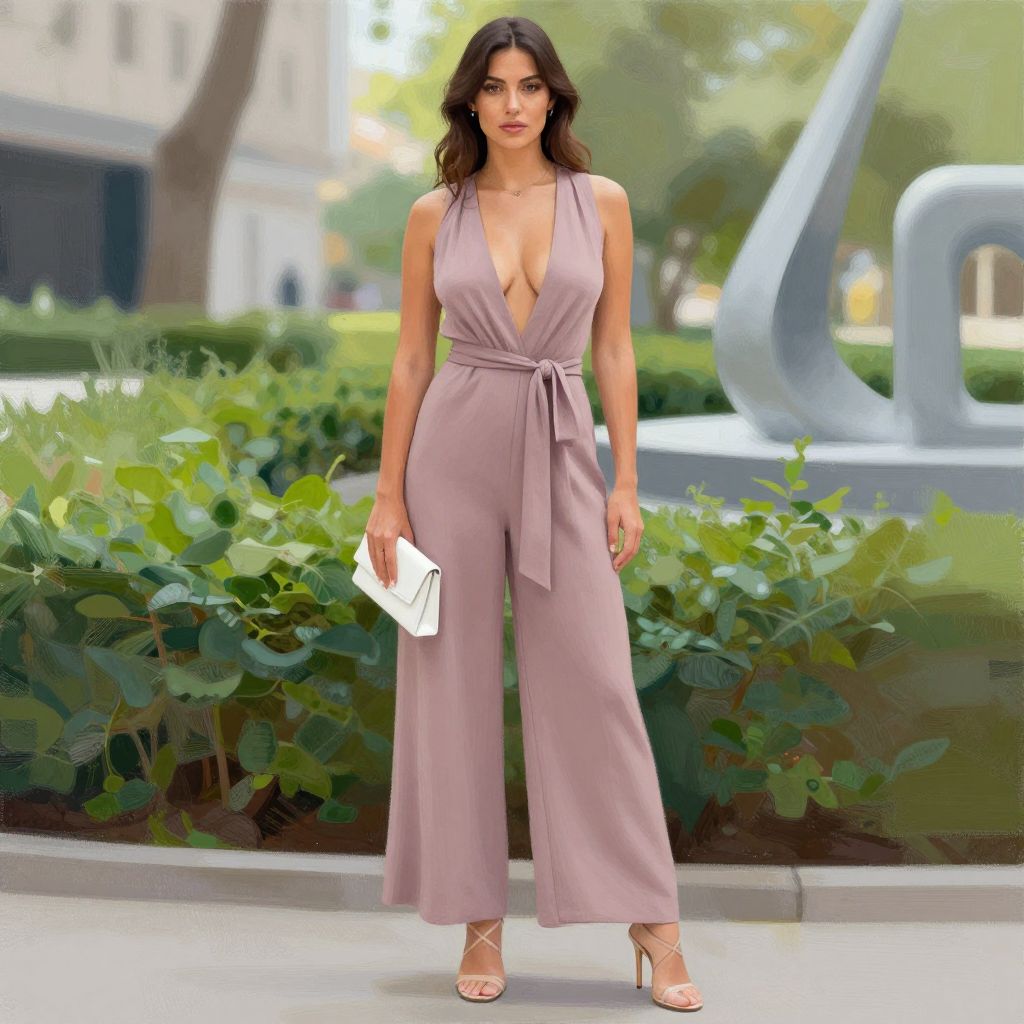 A woman, contemporary chic, mauve wide-leg jumpsuit, sleeveless with a plunging v-neckline, gathered waist with tie sash, side pockets, minimalistic white clutch, strappy high-heeled sandals, standing in a sunlit urban garden, surrounded by lush greenery and modern sculptures, underpainting style, soft brushstrokes, muted colors Sexy. Pretty face and beаutiful eyes. Big breasts