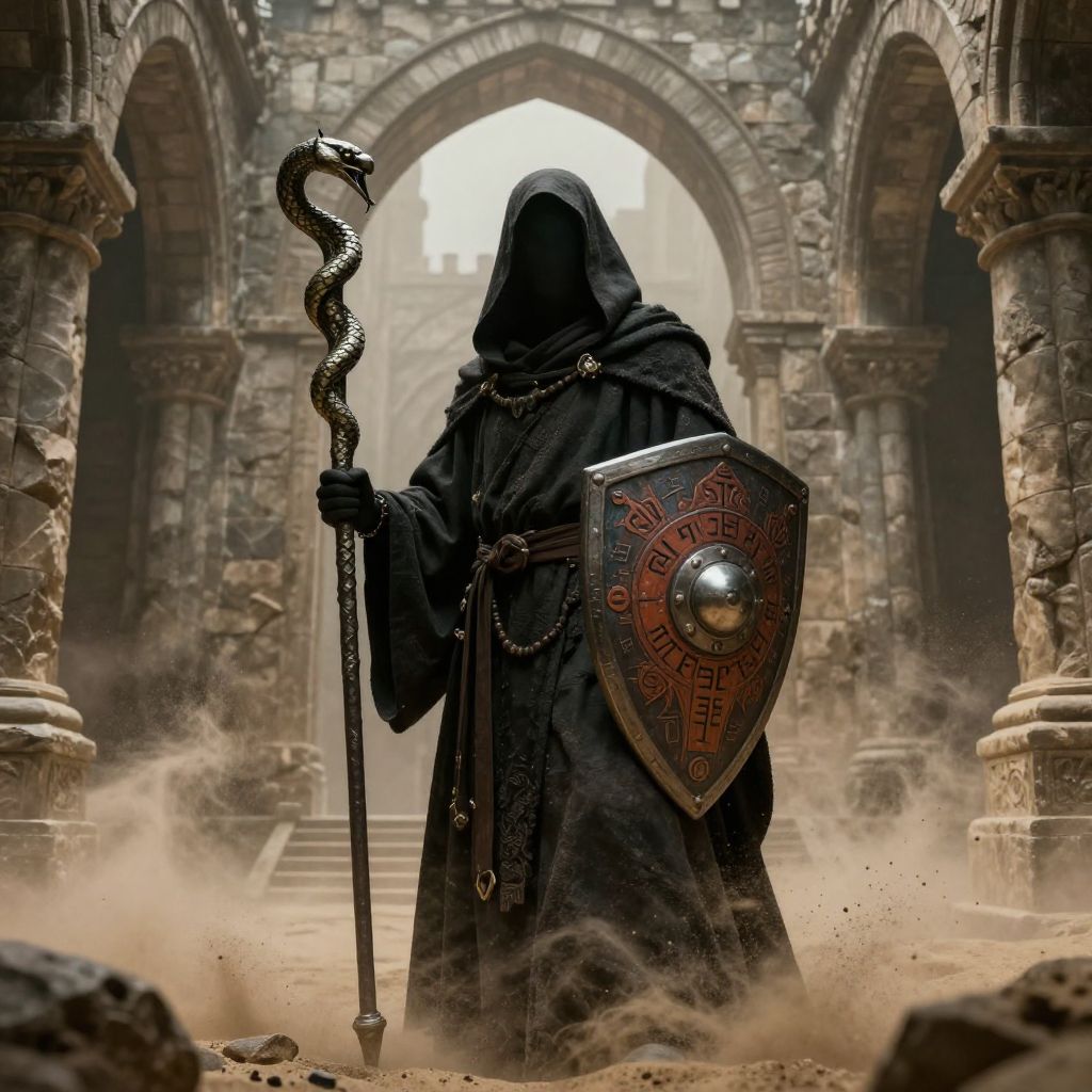 Mysterious hooded figure with serpent staff and ornate shield in dusty, ancient stone archway. Dark, medieval fantasy scene. Digital art.