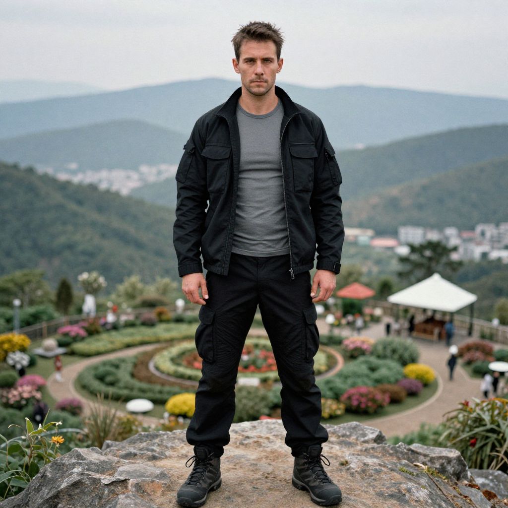 Photograph of a Caucasian man with short, dark brown hair and a trimmed beard, standing on a rocky outcrop. He is wearing a black jacket over a gray t-shirt, black cargo pants, and black boots. His expression is serious, and he stands with his hands at his sides. The background features a lush, green mountainous landscape with a winding garden path, colorful flower beds, and blurred figures of people. The sky is overcast, and distant buildings are visible on the right. The garden has a white gazebo and red-roofed structures. The overall scene is vibrant and natural.