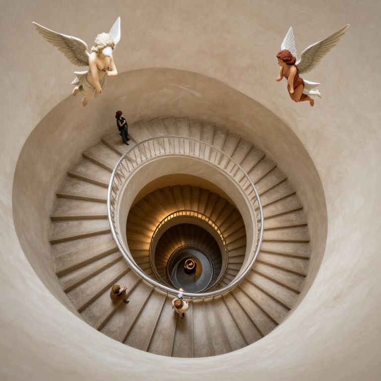 Photograph of a spiraling staircase viewed from above. The staircase is made of stone and features a circular design with a central light source at the bottom. Two large, white-winged angel statues with golden skin, one on the left and one on the right, hover at the top. A person in dark clothing is standing on the second tier of the staircase, while two other individuals are seated on the lower levels. The walls are smooth and white, enhancing the architectural elegance. The lighting creates a soft, warm glow on the stone steps.