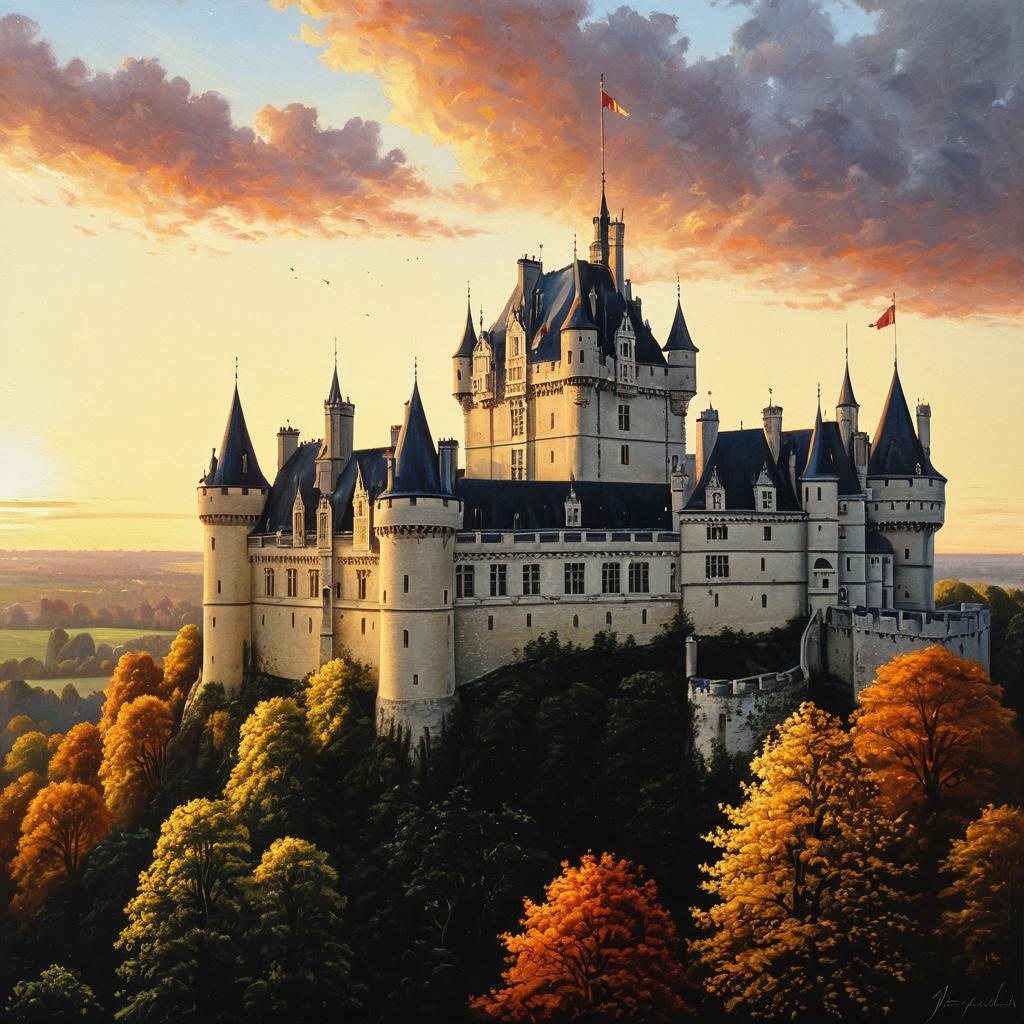 A detailed oil painting of Pierrefonds Castle in France, captured at sunrise with warm tones illuminating the historic architecture. The castle stands prominently atop a hill surrounded by autumn foliage in shades of orange, yellow, and green, under a dramatic sky with soft clouds.