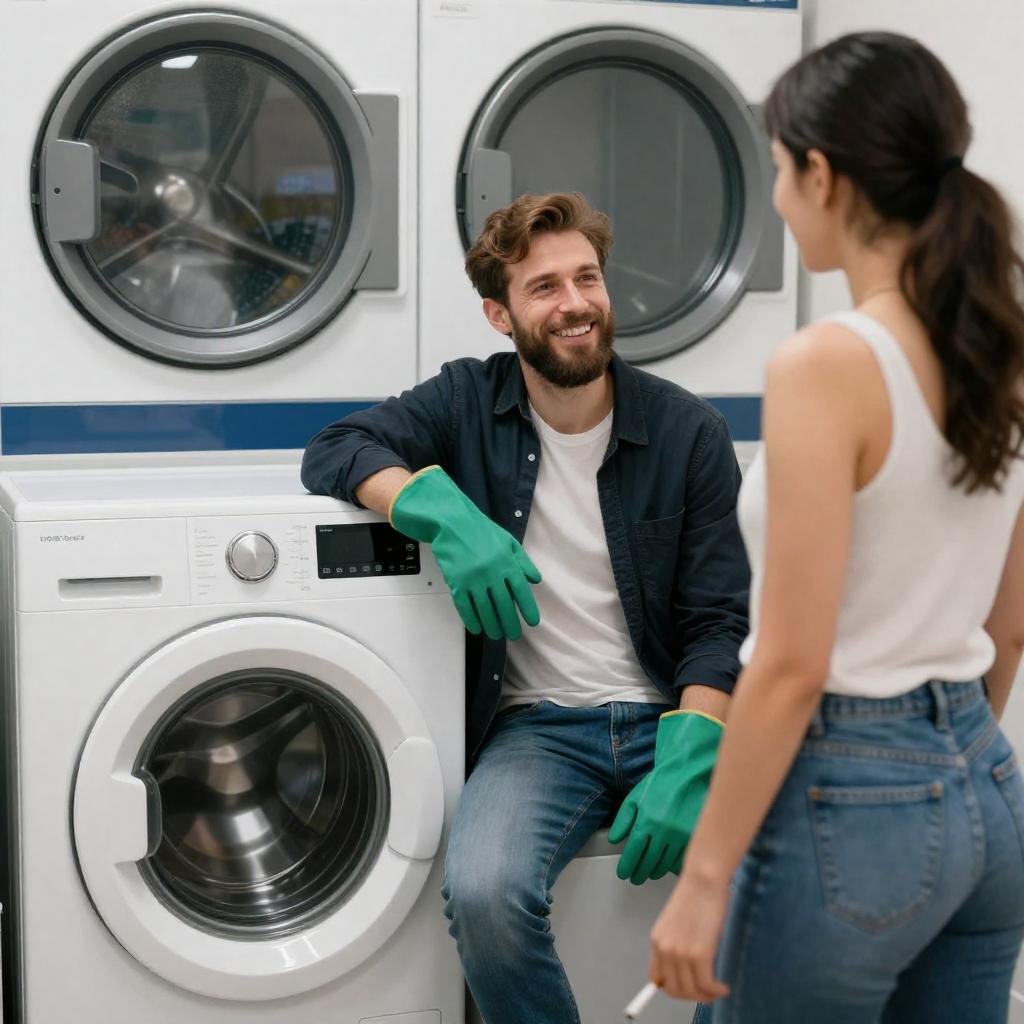 Photograph of six people in a brightly lit room. A woman with red checkered shirt and pink skirt bends forward, surrounded by five men in various colored shirts (white, teal, yellow) flexing their arms towards her. Large window with white flowers in the background. Basket on floor, fruit on tray to the left. All men have muscular builds, woman has medium build. Expressions are intense, focused.