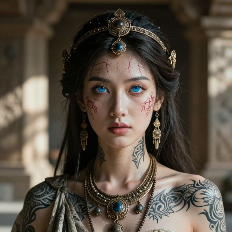 A highly detailed digital painting of an ethereal woman with striking blue eyes and pale skin, adorned with intricate black tattoos and red scars on her face. She wears an elaborate golden crown and matching jewelry, including a necklace with an oval blue gem. Her dark, straight hair falls past her shoulders. She has a serious expression, and her shoulders are bare, revealing more tattoos. The background is a blurred, sunlit stone structure, adding a mystical ambiance. The image combines realistic and fantasy elements, emphasizing her otherworldly beauty.