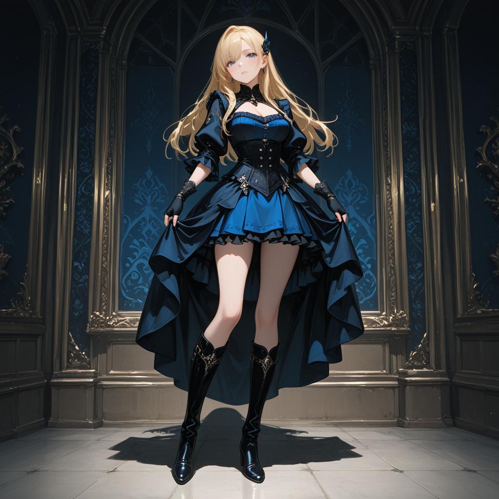 Masterpiece, best quality, 1girl, blonde hair, blue eyes, boots, dress, fingerless gloves, frills, full body, gloves, knee boots, lips, long hair, skirt, solo, (extremely detailed CG unity 8k wallpaper, ultra-detailed, best shadow), (detailed background), (beautiful detailed face, beautiful detailed eyes), High contrast, (best illumination, an extremely delicate and beautiful)