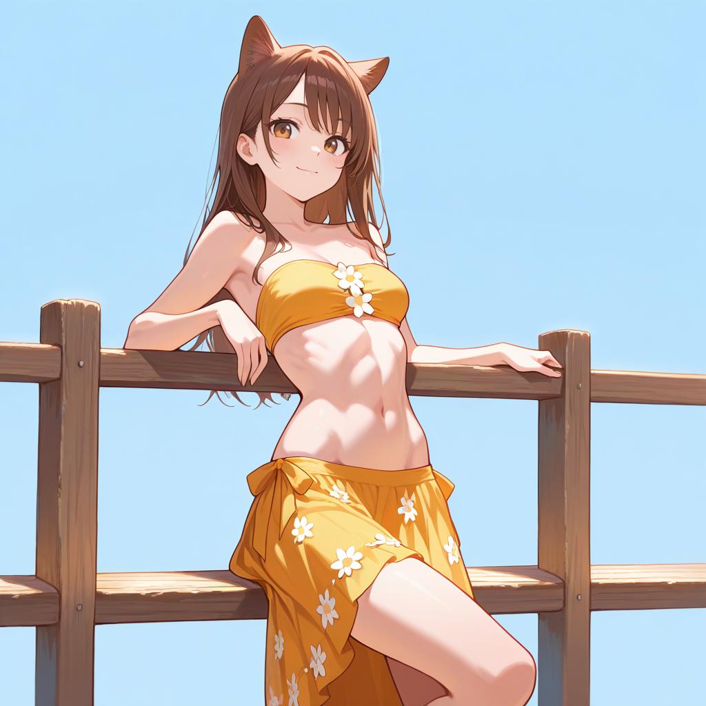 Digital illustration of an anime-style girl with long brown hair, wearing a white bandeau top and a flowing white skirt, leaning against a wooden fence under a clear blue sky. The character has a toned abdomen and a gentle smile, with hair slightly blowing in the breeze.