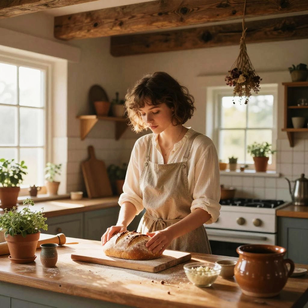 Cottagecore girl short hair baking bread in a cozy kitchen with wooden beams, surrounded by potted herbs and hanging dried flowers, warm sunlight streaming through windows, rustic pottery, soft warm colors, capturing the essence of simple rural life