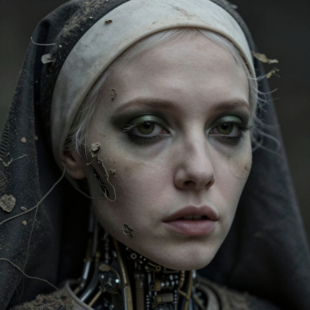 Digital artwork of a cybernetic nun with pale, freckled skin and striking blue eyes. She wears a black and white habit, with visible robotic components on her neck and cheek. Her face is detailed with realistic textures, including freckles and subtle makeup. The background is blurred, dark, and indistinct, emphasizing her face and cybernetic features. The image combines realistic human elements with futuristic cybernetics, creating a contrast between the traditional religious attire and the modern technology. The overall color palette is monochromatic with blue accents in her eyes.