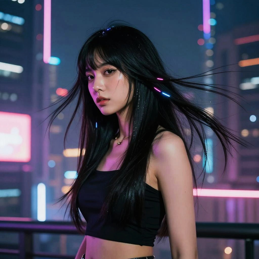 Jet black hair women in a futuristic cityscape, neon lights reflecting off sleek hair, cyberpunk vibe, vibrant colors, dynamic pose, detailed urban background