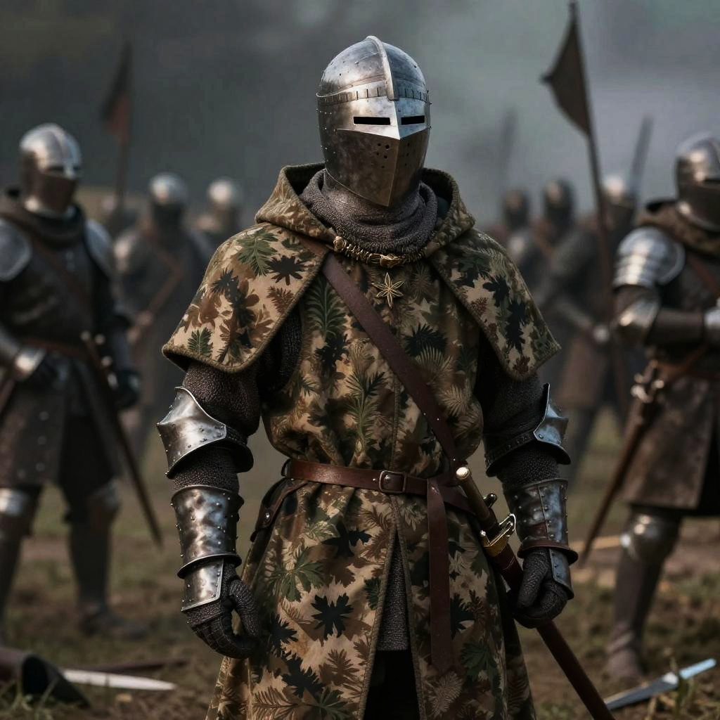 Medieval camouflage cloak worn by a knight in a shadowy battlefield, muted earthy tones, natural foliage patterns, finely detailed fabric and metal, dramatic light and shadow