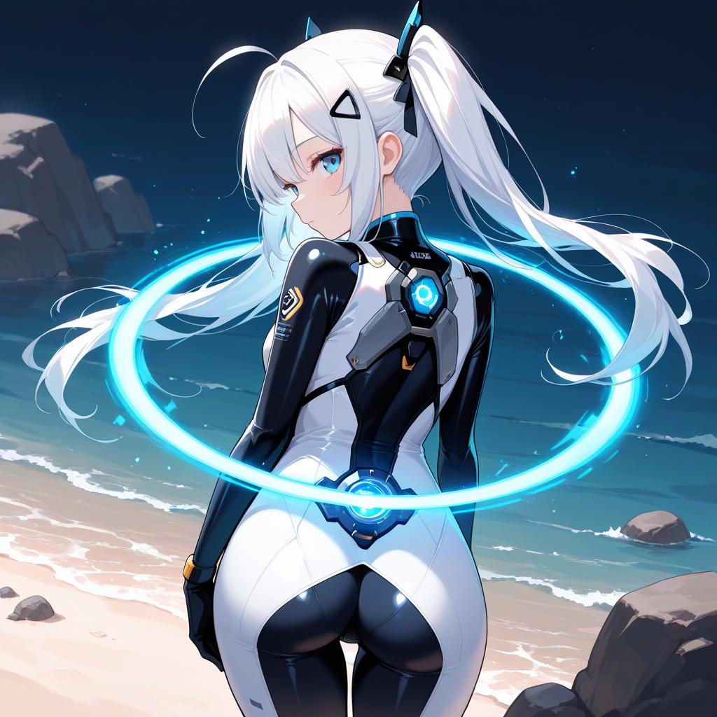1girl, blue eyes, twintails, long hair, white hair, ahoge, hair ornament, hair ribbon, hairclip, solo, from behind, looking at viewer, looking back, futuristic bodysuit set, magical portal, timid demeanor, beach-side rock