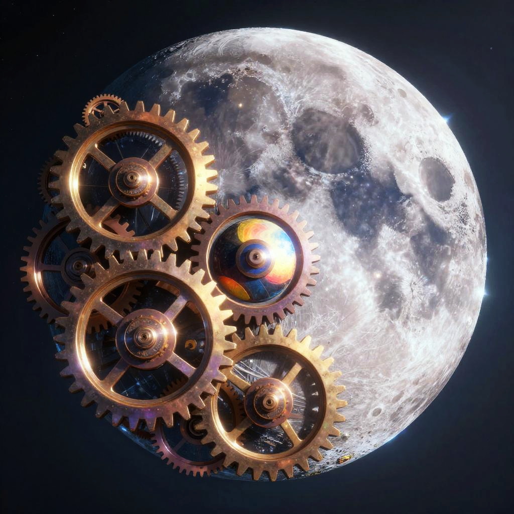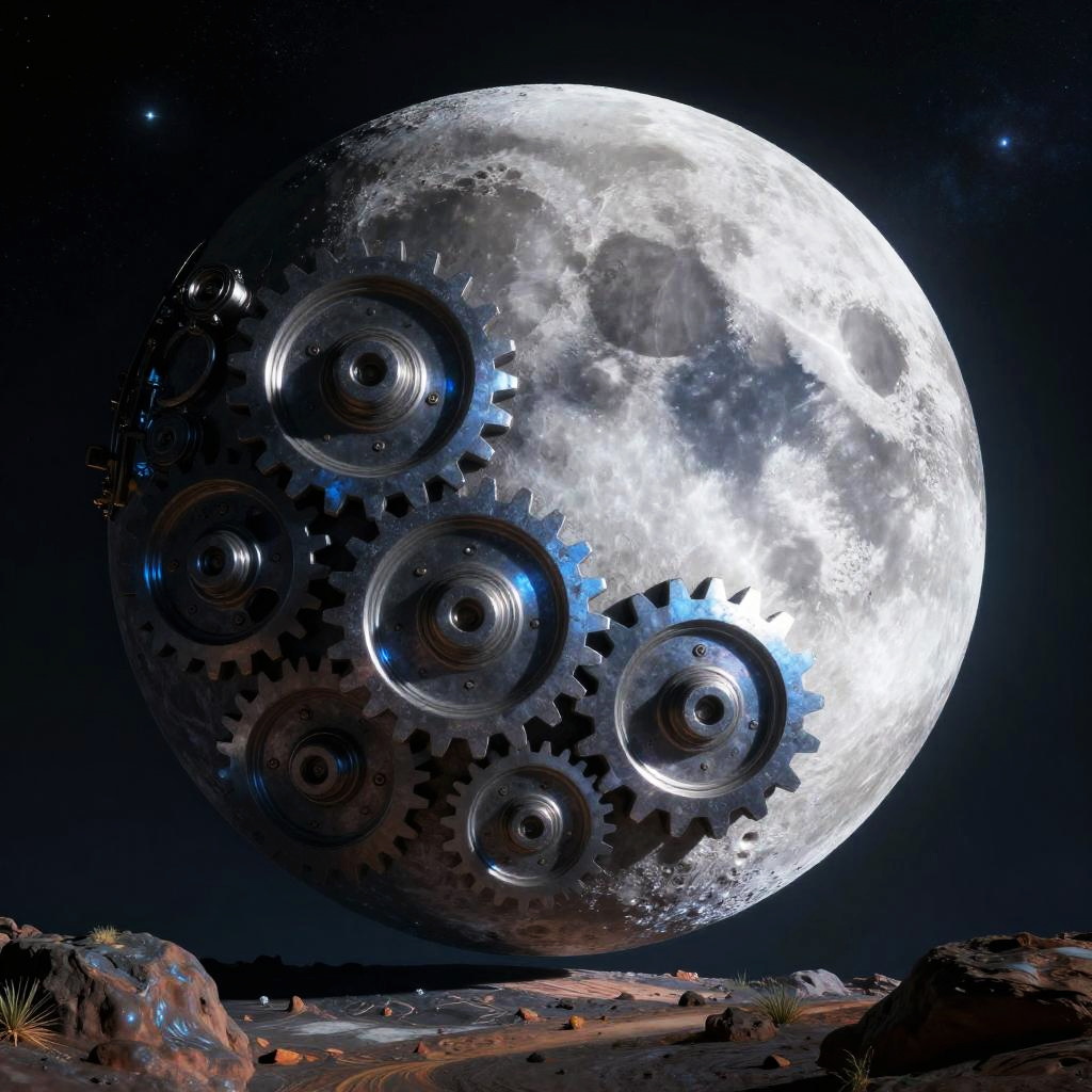 Epic scene featuring gear 5 moon suspended in space above a rugged alien terrain, massive interlocking gears embedded in the moon's surface, reflecting blue and silver light, dramatic shadows and cosmic backdrop, ultra-detailed realism.