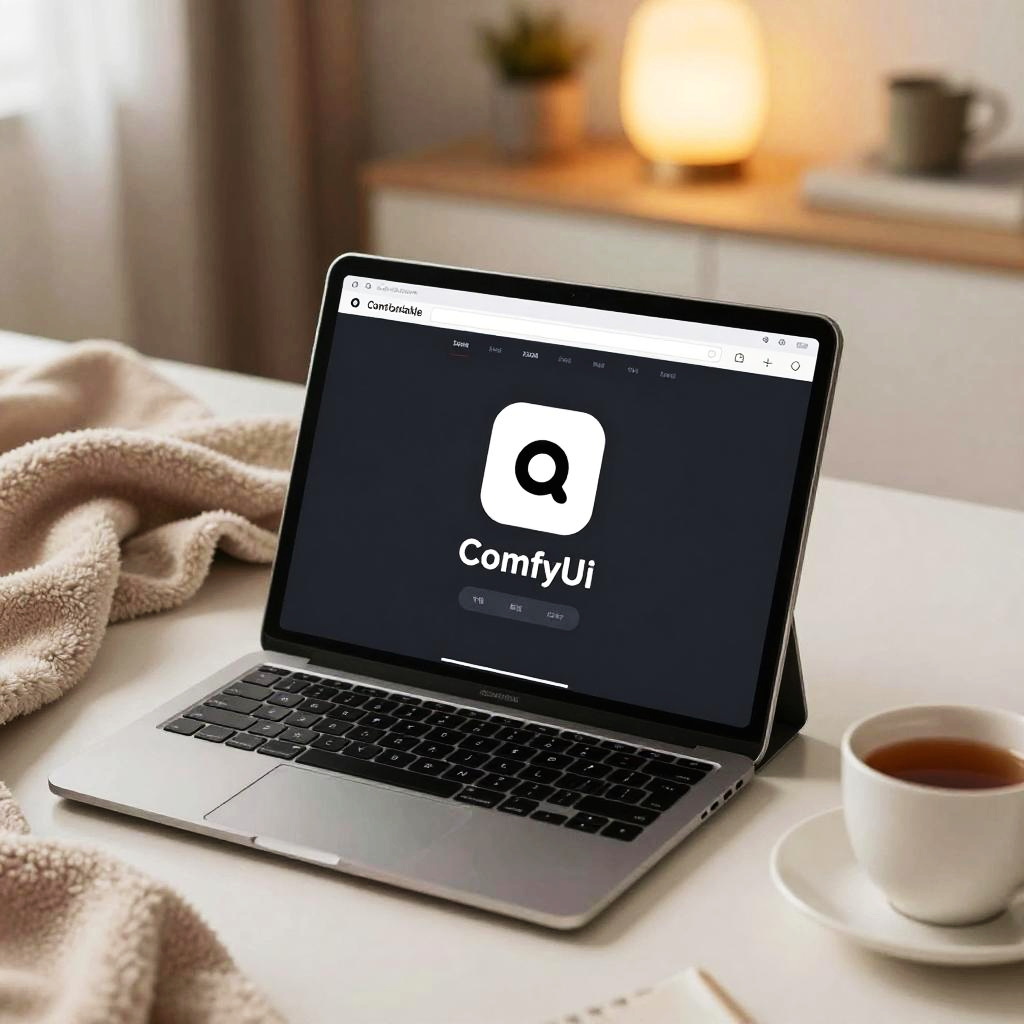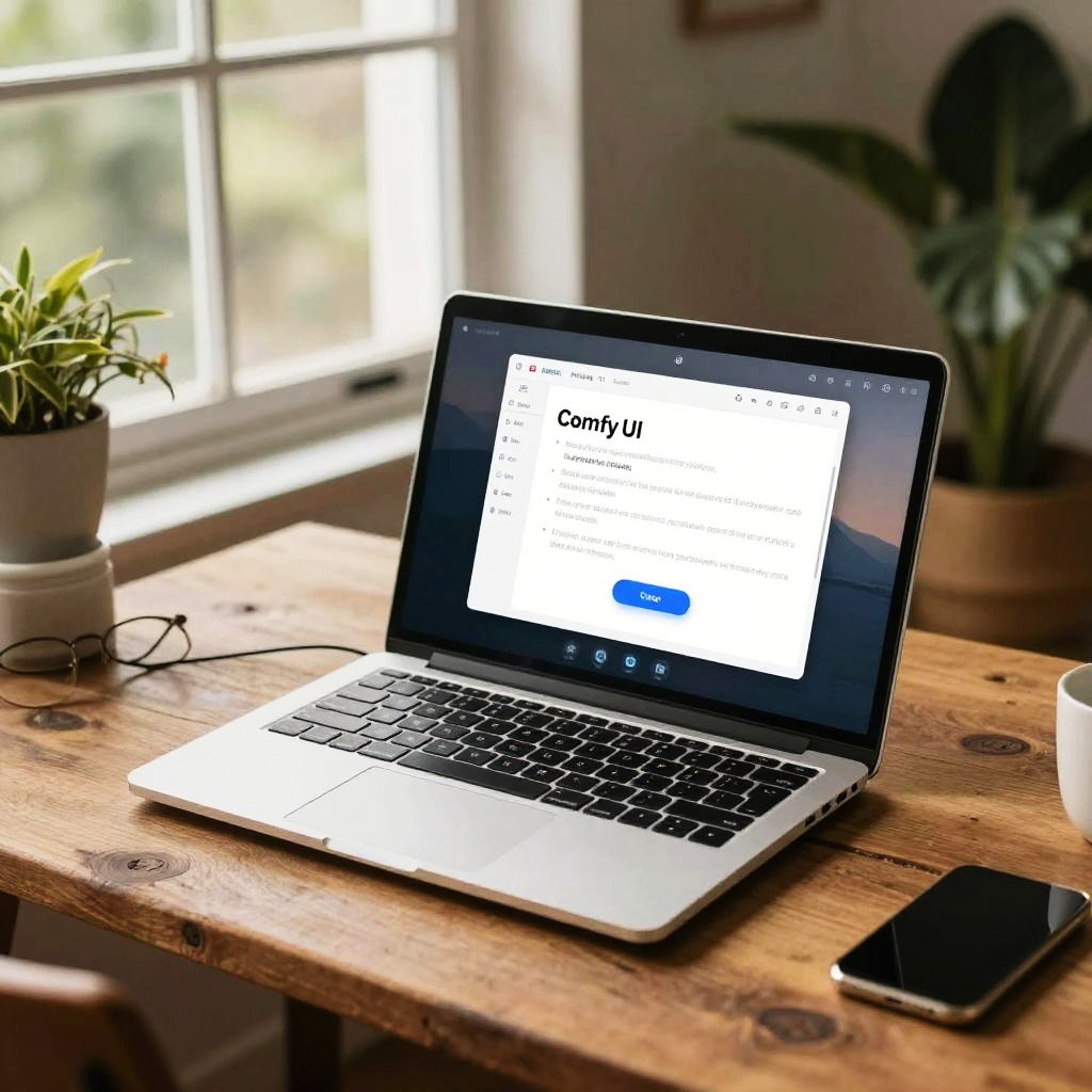 ComfyUI portable setup featuring a lightweight laptop with intuitive UI on screen, placed on a rustic wooden desk by a sunny window, green plants nearby, soft natural light highlighting the calming and user-friendly design aesthetic.
