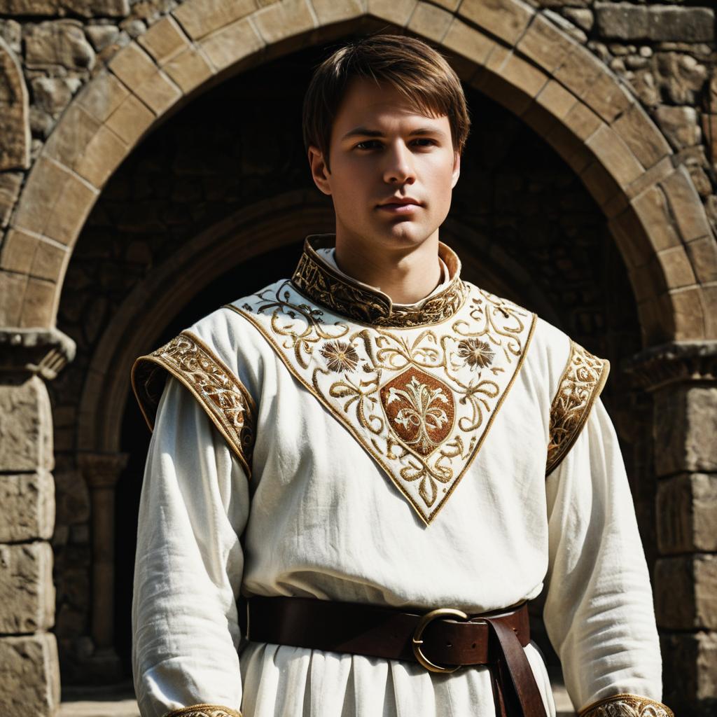 Photorealistic image of a male medieval knight standing confidently under a stone archway. He has long brown hair and wears a green and red medieval tunic with gold trim, green sleeves, and a brown leather belt with a gold buckle. The knight is posed with hands on hips on a stone-paved path, surrounded by lush greenery and detailed stone architecture. The scene is set outdoors in daylight with realistic lighting and cinematic quality.