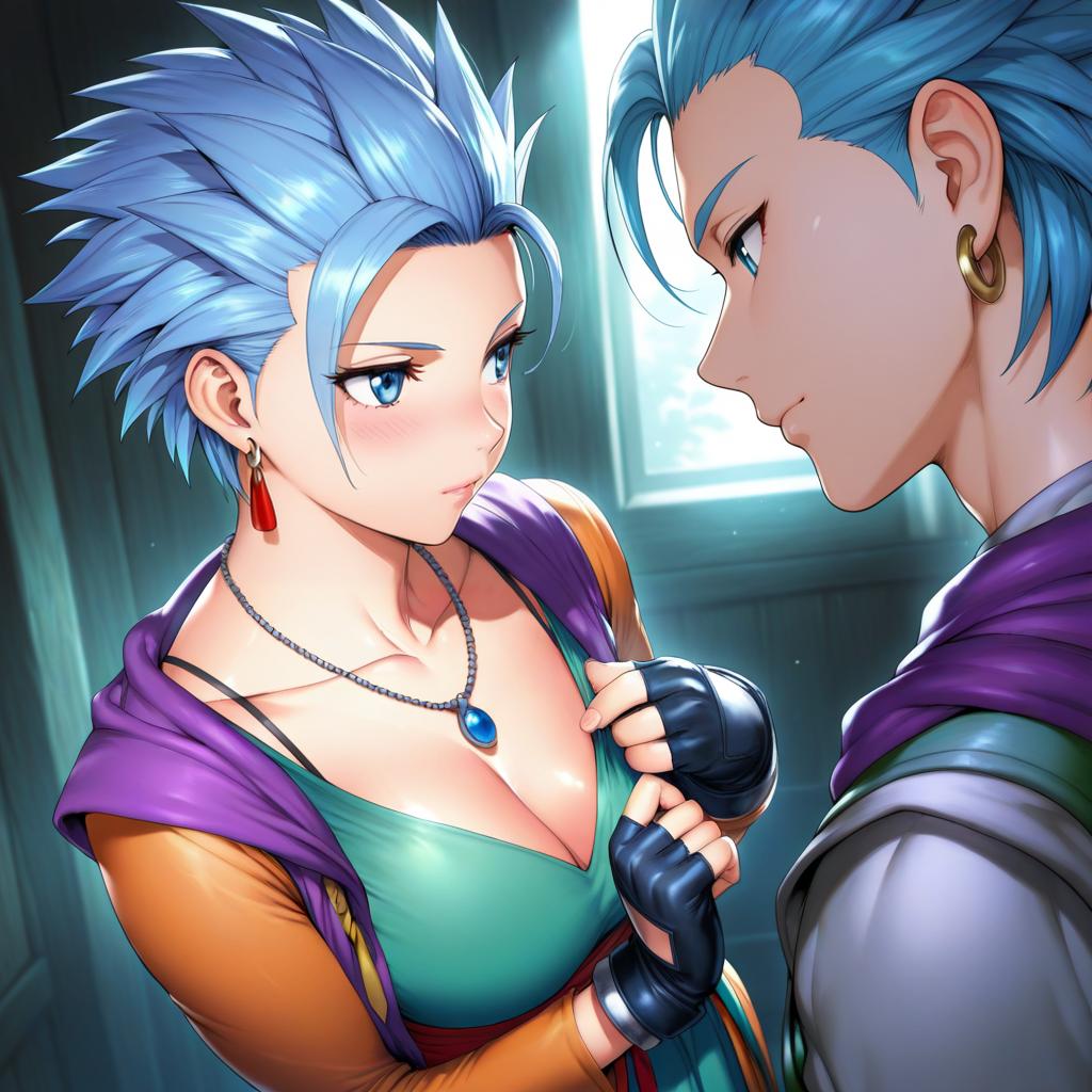 Camus (dq11), dragon quest, 1boy, blue eyes, short hair, spiked hair, blue hair, collarbone, fingerless gloves, long sleeves, earrings, necklace, by artist orushibu, illustrious