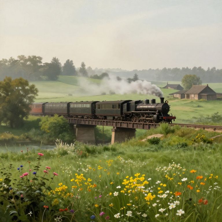 Yesteryear countryside view with a vintage steam train crossing an old iron bridge, surrounded by lush green fields and blooming wildflowers, morning mist rising, rustic farmhouses in the distance, evocative of early 20th century rural life, painterly style.