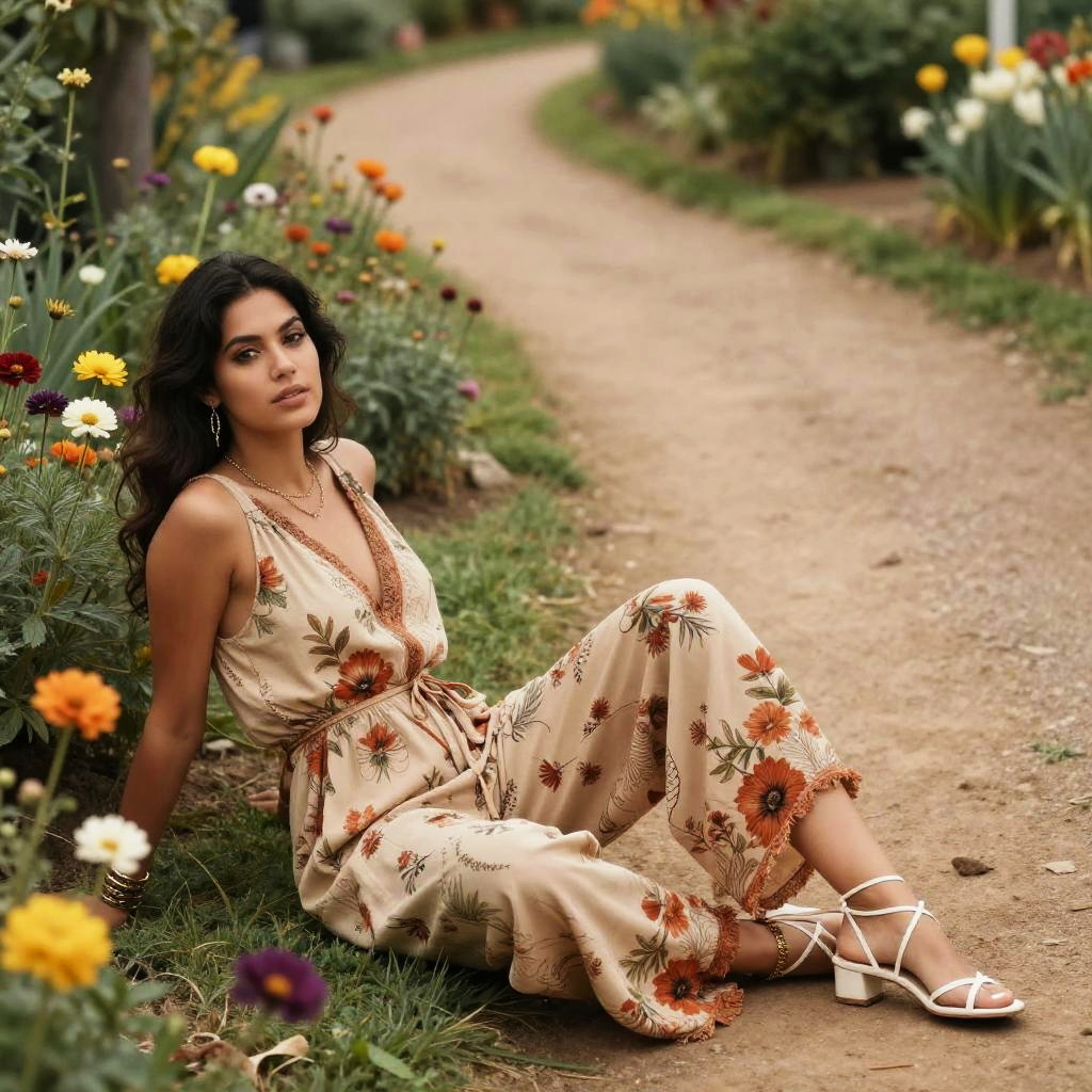 A svelte woman in a boho-chic sleeveless beige jumpsuit with a rust floral print, lounging in a flower garden along a winding trail, styled in a seven seas visual aesthetic, paired with thin strappy white heels, layered bracelets, and drop earrings. Sexy. Pretty face and beutiful eyes