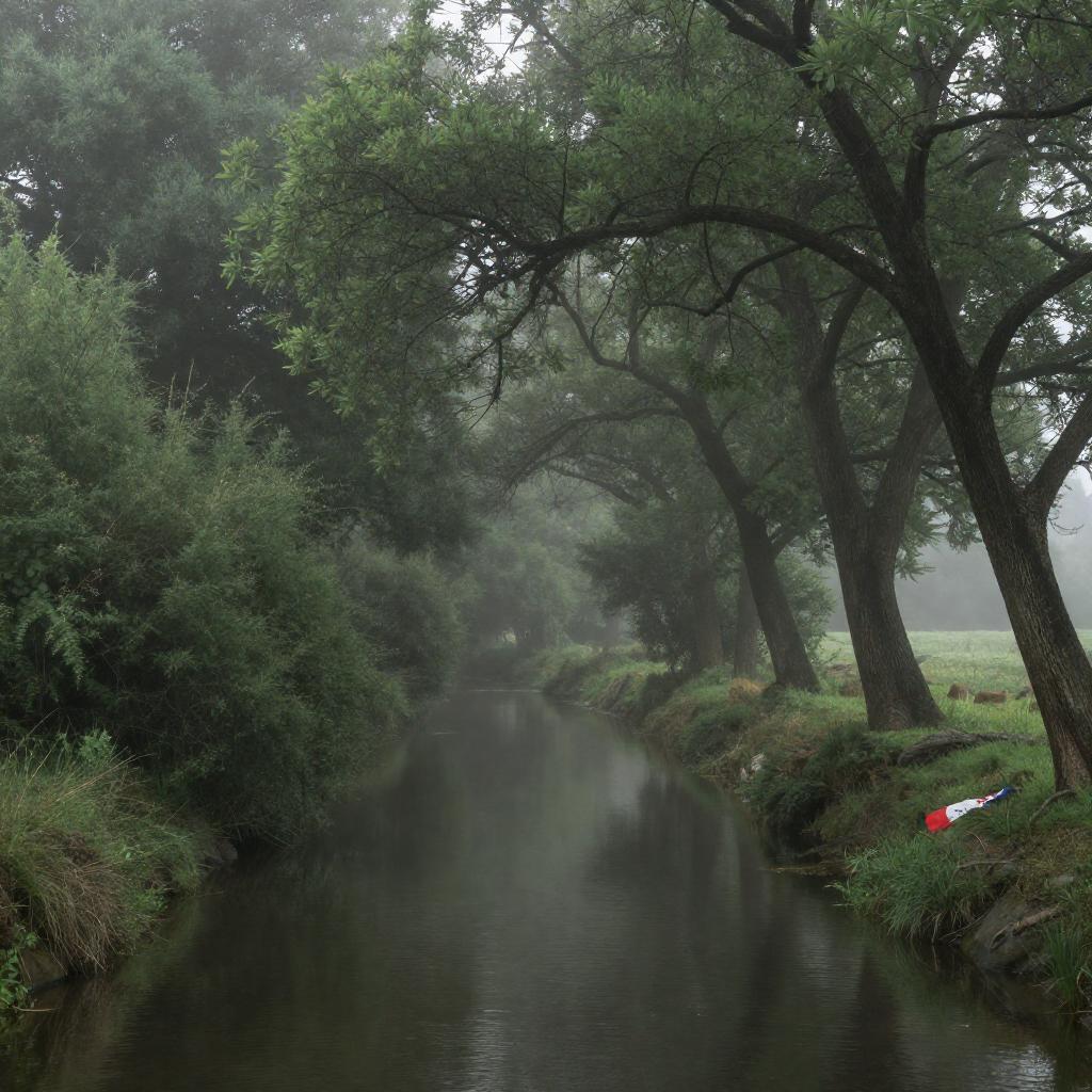 Photograph of a misty forest scene with a calm, reflective stream running through the center. Tall, leafy trees with gnarled branches frame the right side, while dense fog softens the background. A small, red and white object, possibly a piece of clothing, lies on the grassy bank to the right.
