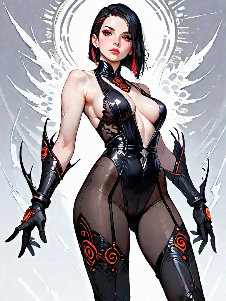 1girl, source_comics, realistic face, full body shot, Woman, cocktail attire, velvet wrap dress in deep red, plunging V-neckline, long sleeves, thigh-high slit, fitted silhouette, metallic strappy high heels, simple stud earrings, white studio background