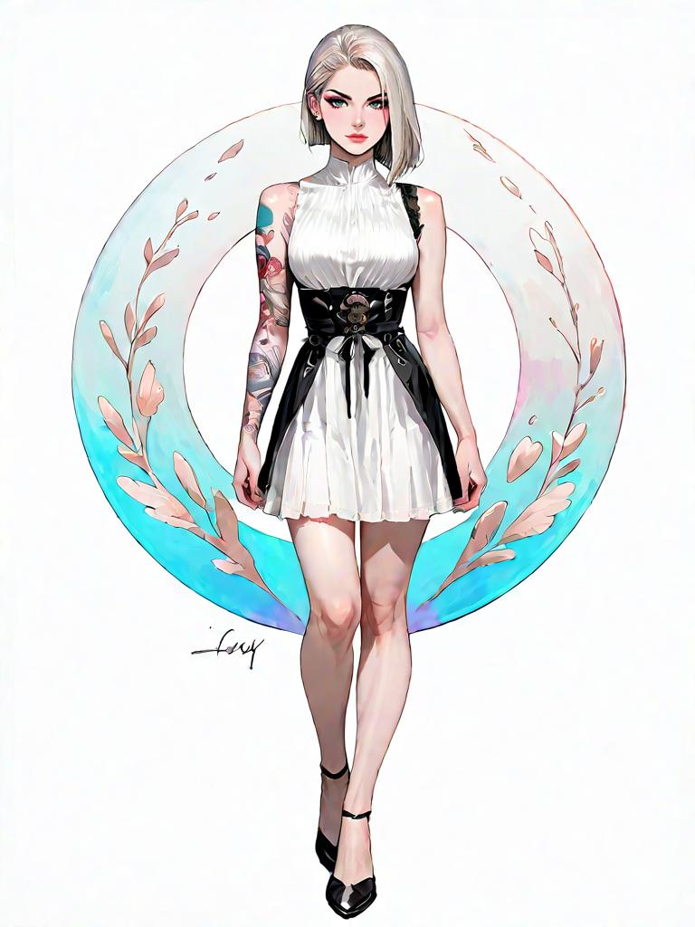 Digital artwork of a glamorous woman with silver hair styled in an updo, wearing a white and blue velvet wrap dress featuring a plunging V-neckline, long sleeves, and a thigh-high slit. She is accessorized with metallic strappy high heels and star-shaped earrings, posed in front of a minimal white background with a red circle element. The image showcases a fashionable full-body portrait emphasizing the dress's fitted silhouette.
