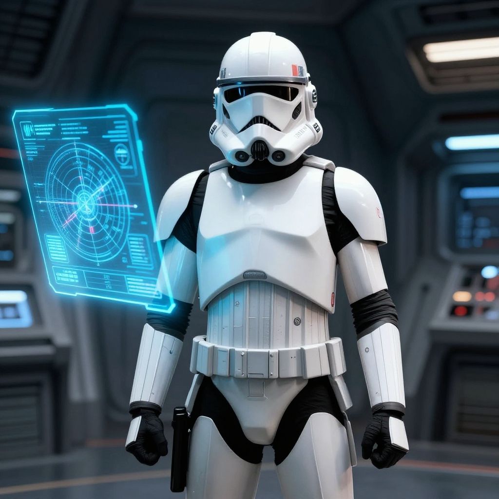 Star Wars female clone commander in advanced battle gear, holographic map display, starship interior background, determined look, high-tech detailed environment