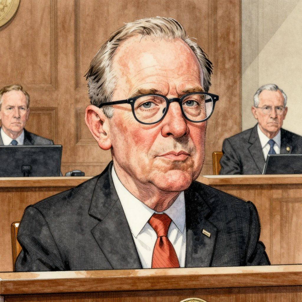 Digital illustration of an older white man with gray hair, black glasses, and red tie, seated at a wooden courtroom podium, flanked by two other