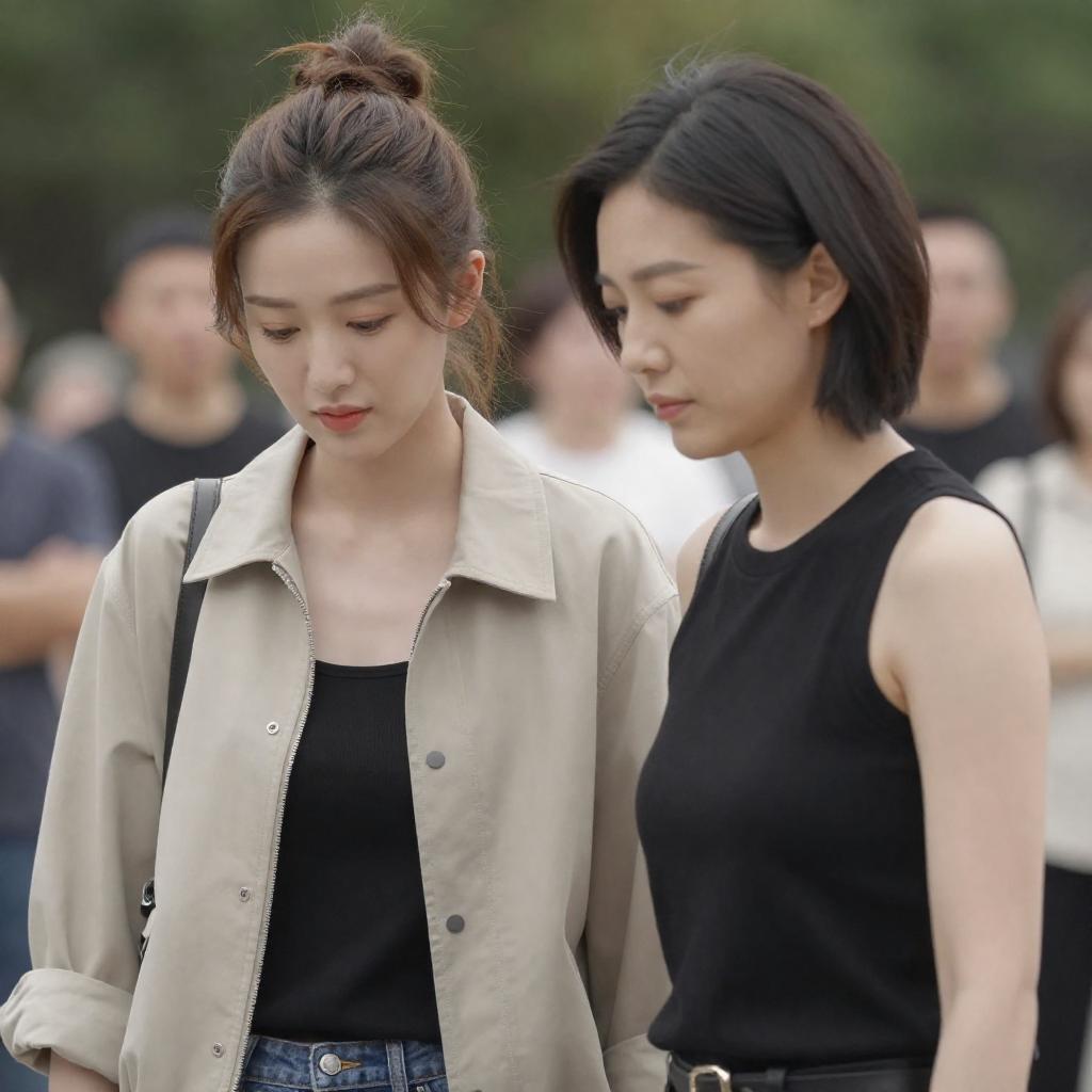 Photograph of two young Asian women standing outdoors in front of a white building with a parking sign. The woman on the left has short brown hair, wears a red cardigan over a white top, and has her arms crossed while looking to the right. The woman on the right has long black hair, wears a white cardigan over a pink top, and looks straight ahead. The background includes a blurred person and architectural elements.
