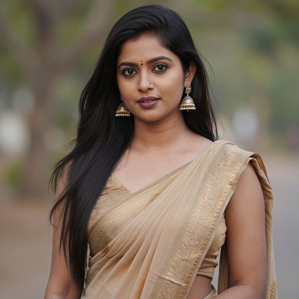 Photograph of an Indian woman with long, straight black hair and medium brown skin, wearing a beige saree with intricate gold embroidery. She has dark brown eyes, a nose ring, and wears ornate gold earrings. Her expression is neutral with slightly parted lips. The background is blurred, showing green trees and a gray pathway. The lighting is natural, highlighting her facial features and the texture of the saree. She stands in a three-quarter view, facing the camera. The image has a soft focus on her face and attire, emphasizing her elegant appearance.