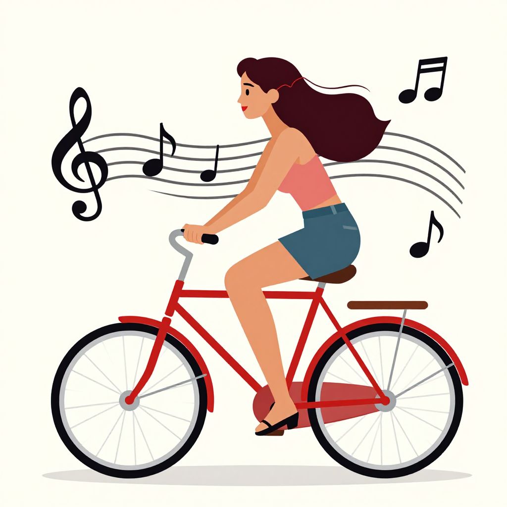 A vibrant vector illustration depicts a stylish young woman riding a classic red bicycle, adorned with a whimsical musical stave and notes, capturing a lively and creative atmosphere in a retro-inspired, high-definition digital art style.
