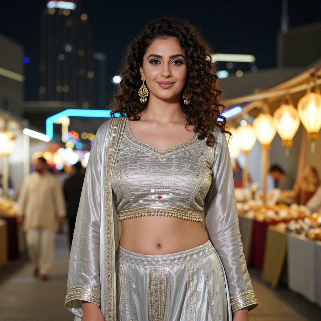 A confident young woman with dark curly hair and a gentle smile in a stylish silver-toned salwar bottom costume standing in front of a neon-lit night market in Dubai, with soft city lights and vibrant lanterns in the background, capturing a fusion of traditional and modern fashion.. The woman has big tits and cute face