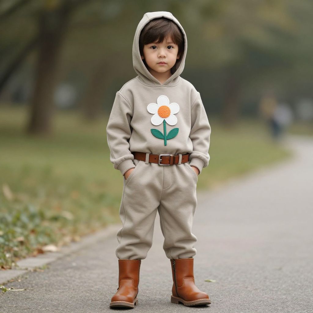 "child clothes costume, solo, male focus, 1boy, hood, hands in pockets, flower, brown hair, boots, full body, standing, belt, looking at viewer, blurry, brown footwear Realistic photo of casual sexy person with pretty face"