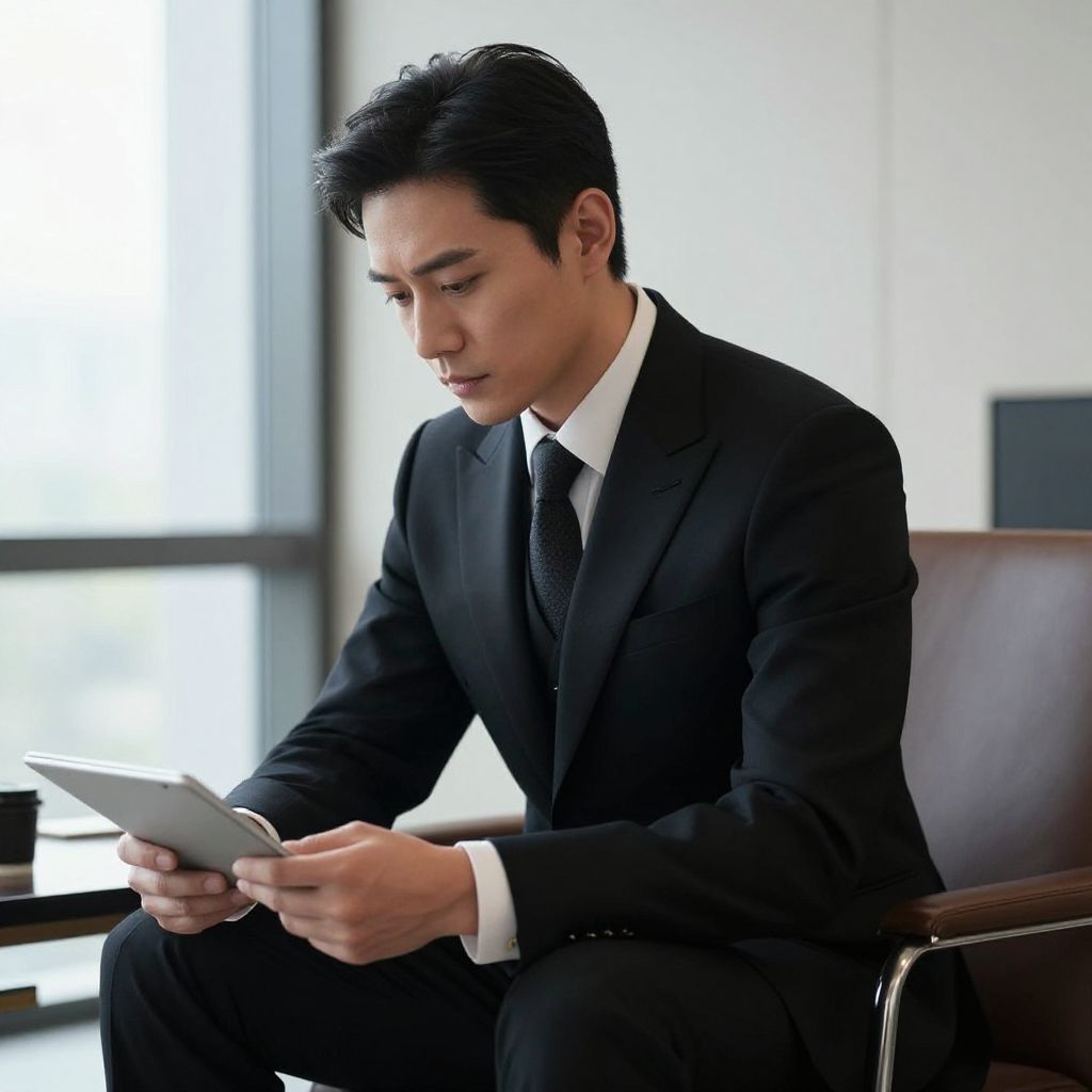 Photograph of an Asian man with short black hair, wearing a black suit with a white dress shirt and black tie, seated on a brown leather chair in a modern office. He is focused on a tablet in his hands, looking down at the screen with a serious expression. The background features large windows letting in bright natural light, and a blurred desk with a black box on the left. The overall color palette is black, white, and brown, with a professional and sleek atmosphere.