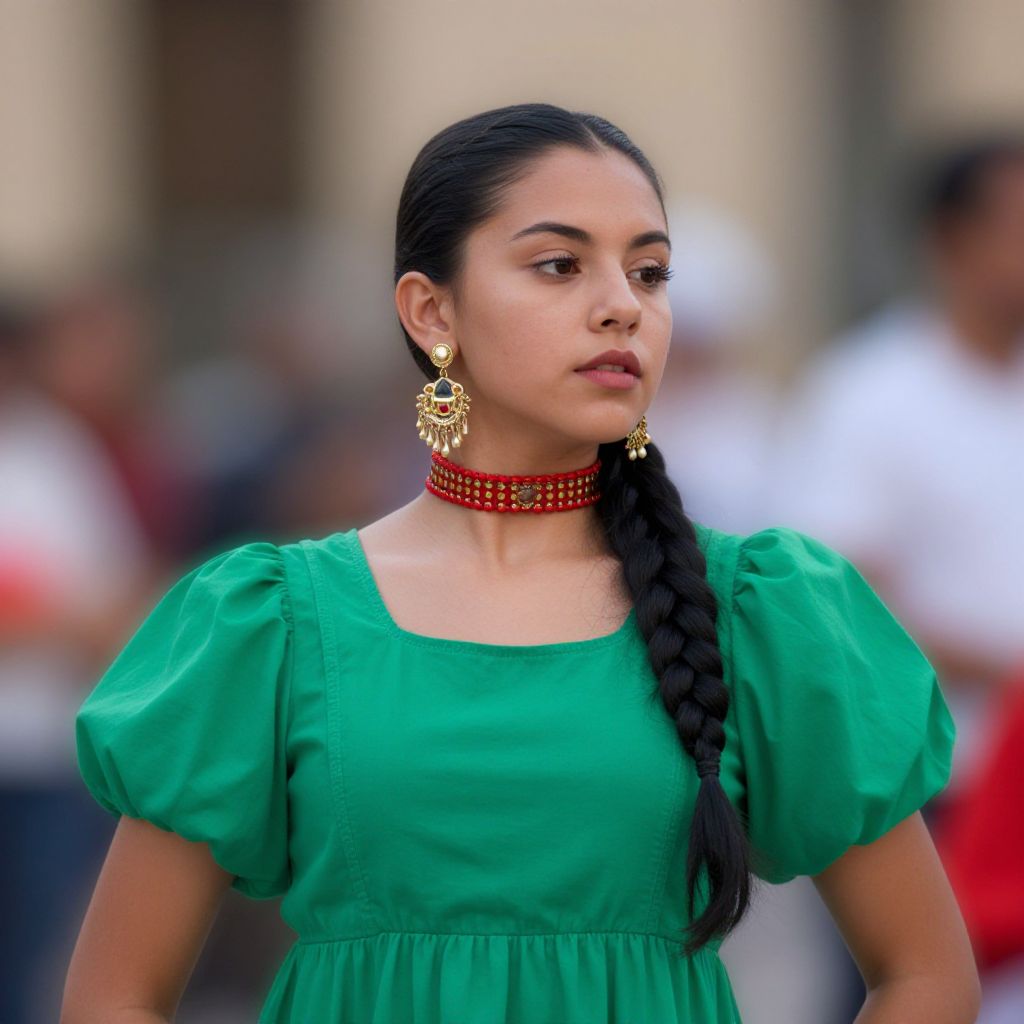 Photograph of a young Latina woman with dark hair in a braid, wearing a green puffed-sleeve dress, red beaded choker