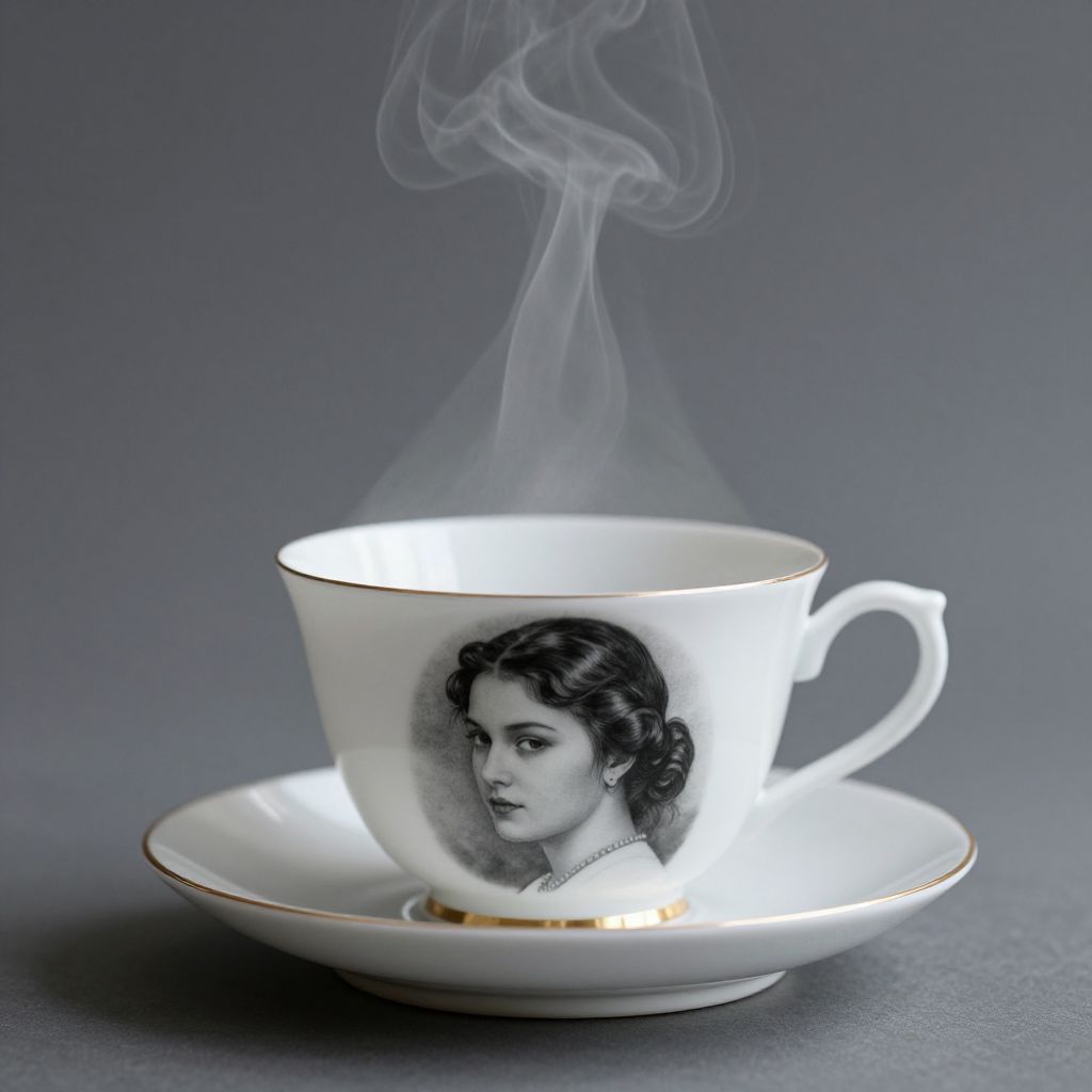 Steam gracefully rises above a delicate porcelain teacup, revealing an intricate black-and-white portrait of a woman's face etched onto its side, as it rests elegantly on a matching saucer against a muted gray backdrop.