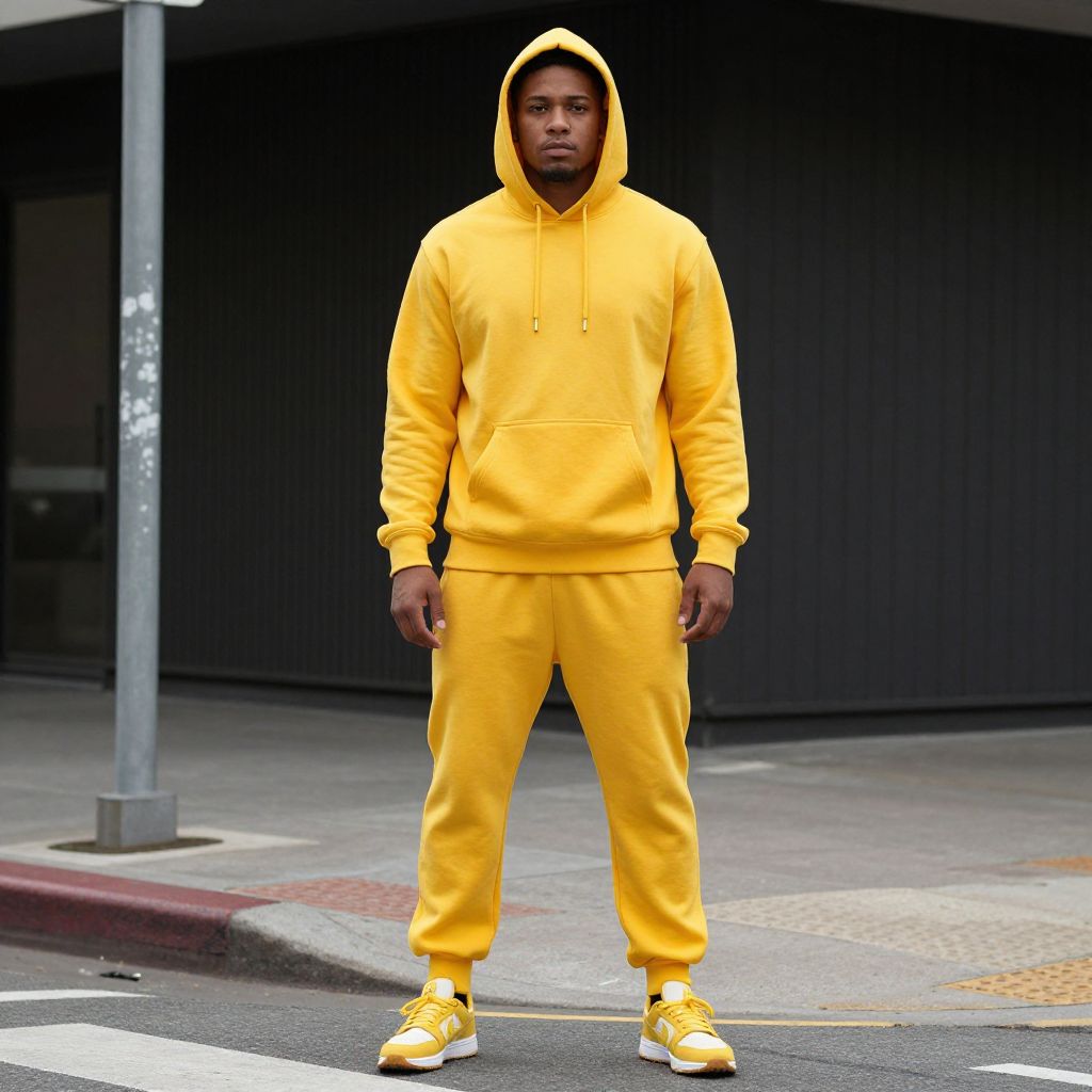 Yellow Sports Day Costume, man in yellow hoodie standing on street corner