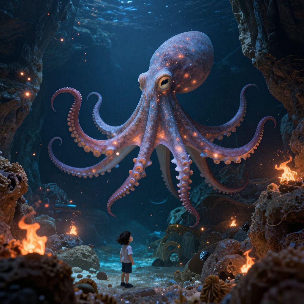 In a mesmerizing 3D-rendered scene, children float serenely on colossal jellyfish in a luminous, zero-gravity cathedral, their movements leaving ethereal trails of luminescent pigment against the deep blue backdrop, evoking a surreal and otherworldly atmosphere.