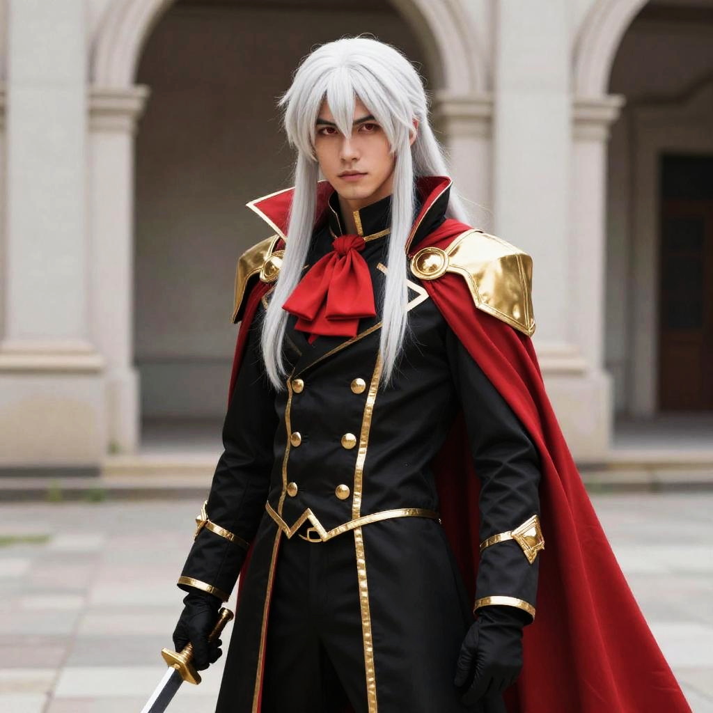 A digital art portrait of a white-haired male cosplayer with pale skin, wearing a black military-style uniform with gold epaulettes and buttons, a red cravat, and a red cape. He has long, straight hair, and his intense blue eyes gaze forward. He holds a sword in his right hand. The background features an archway and stone walls, suggesting a historical or fantasy setting. The image has a realistic, slightly glossy texture, emphasizing the detailed fabric and metallic elements of his costume.
