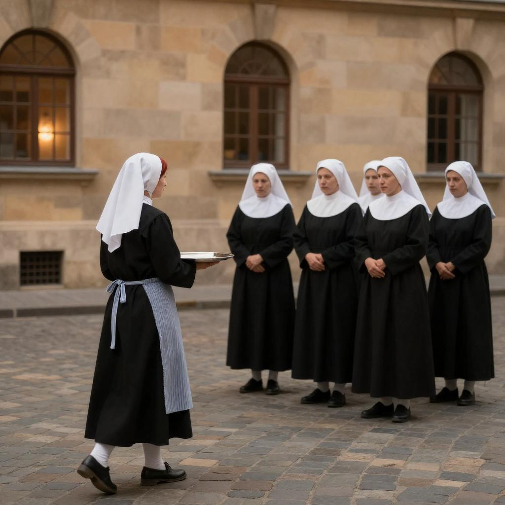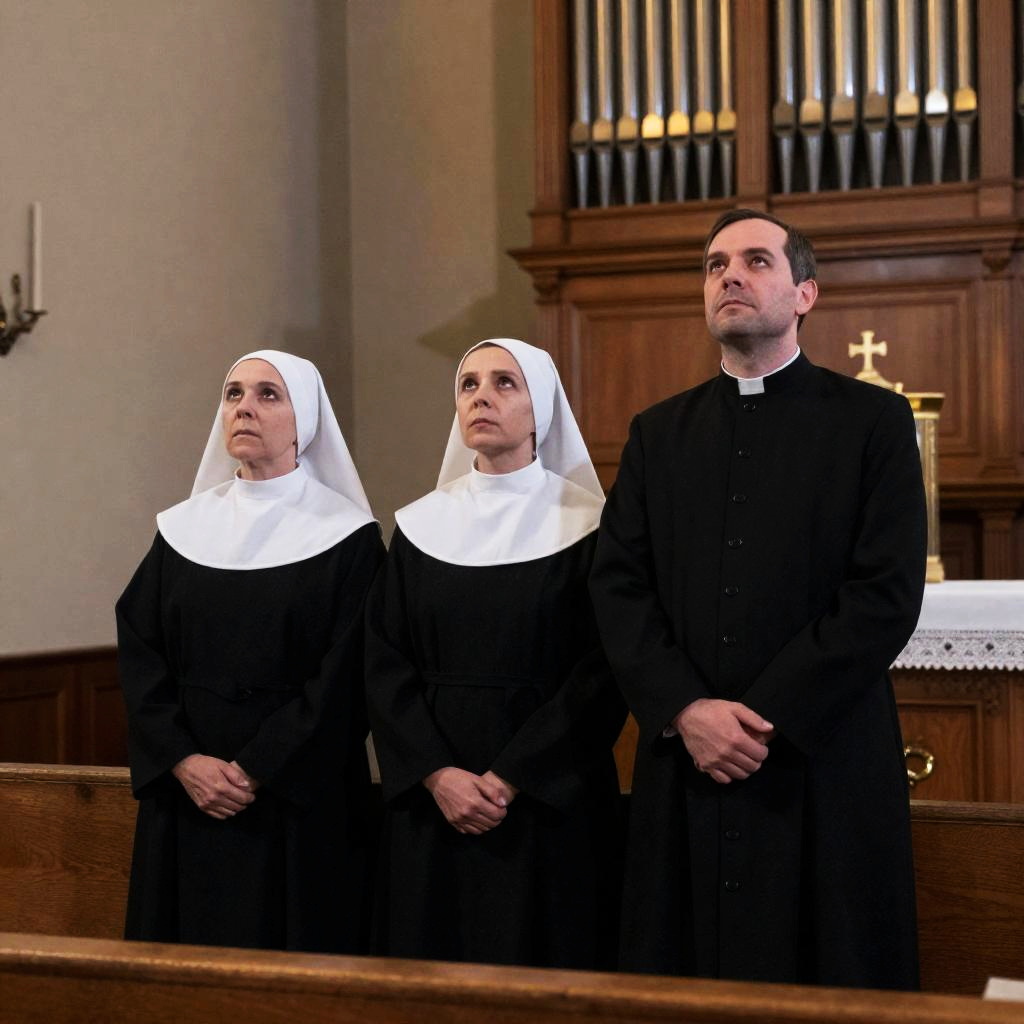 Photograph of three people in a church. Two nuns in black and white habits stand to the left, looking upward. A priest in a black cassock stands to the right, also looking upward. Ornate, patterned wallpaper and a wooden altar with a gold pipe organ in the background. The nuns have serious expressions, while the priest's expression is neutral.