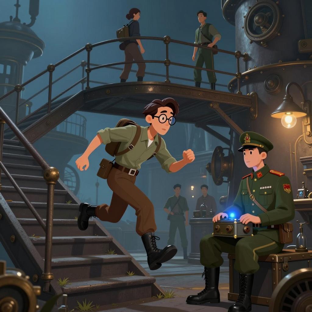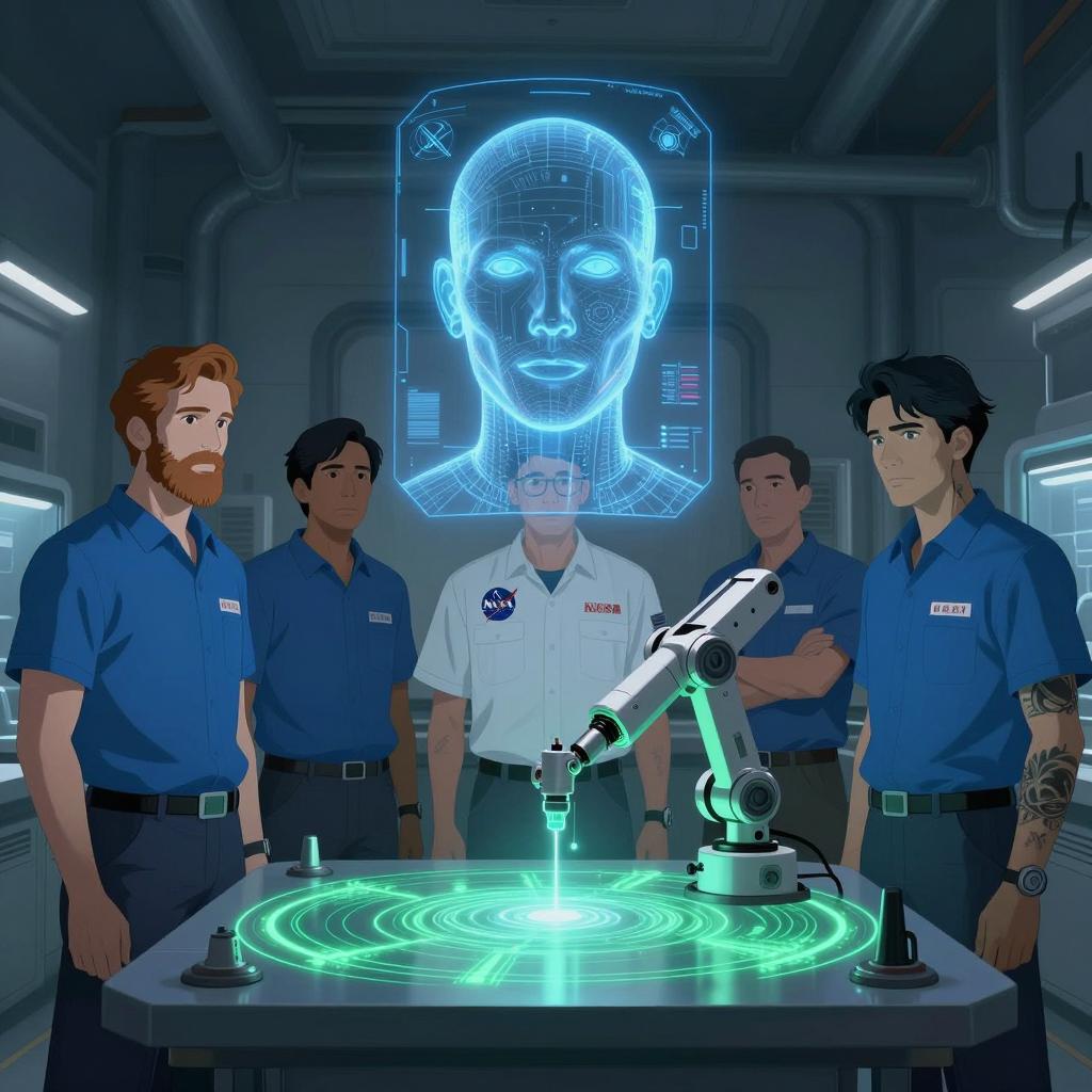 Sci-fi illustration of four people in a dimly lit laboratory. Central glowing blue hologram of a human face hovers above a robotic arm. Three men in blue shirts stand to the left, one with a beard, one in the center wears a white shirt with "NASA" on it, one man with dark hair and tattoos on the right. Bright green holographic patterns on a table in the foreground. Industrial equipment and windows in the background.