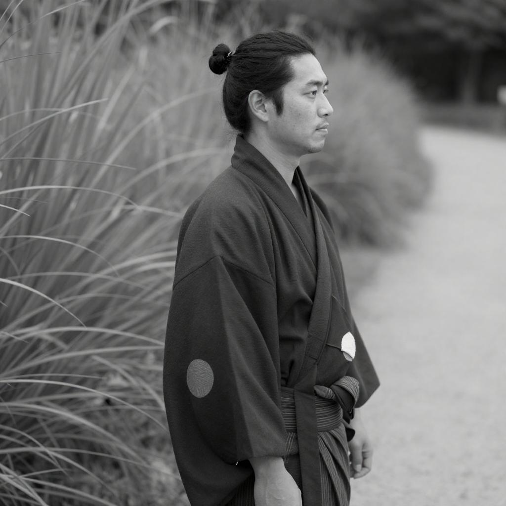 Black and white photograph of a Japanese man with short black hair, wearing a patterned kimono, sitting against a tree. He holds a katana with both hands, eyes closed. Surrounding him are dense wildflowers and foliage. Background includes trees and shadows. Man's expression is calm.