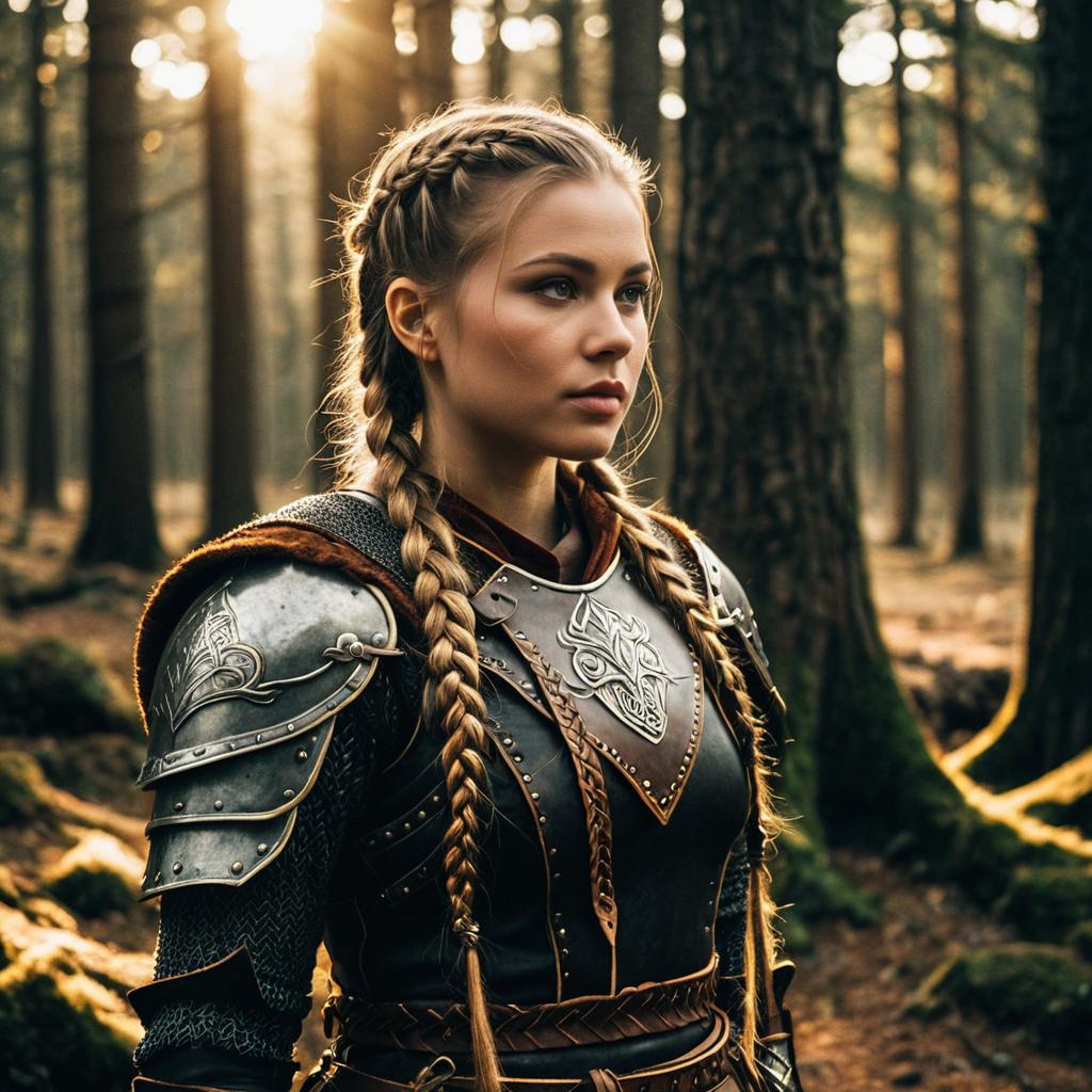 Viking Braids hairstyle on fierce female warrior, wearing battle leather armor, in rocky cliffside, captured in fashion editorial style with golden hour natural light.