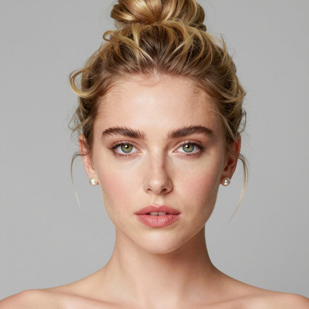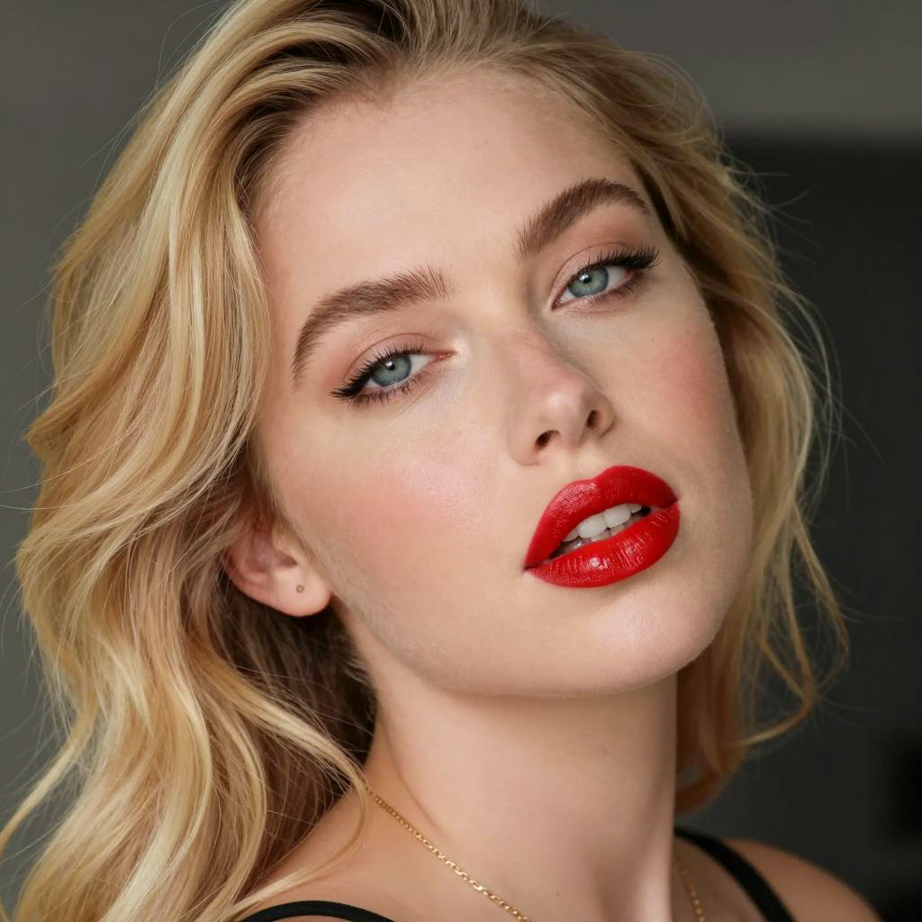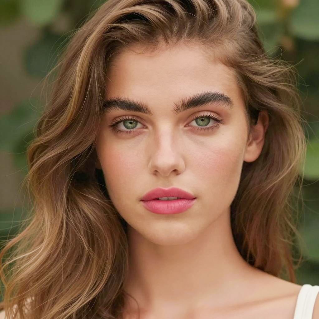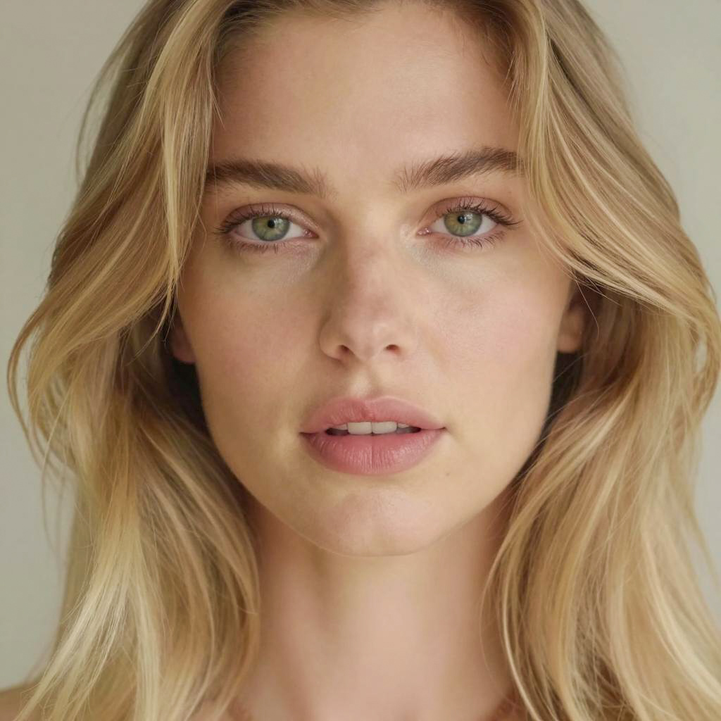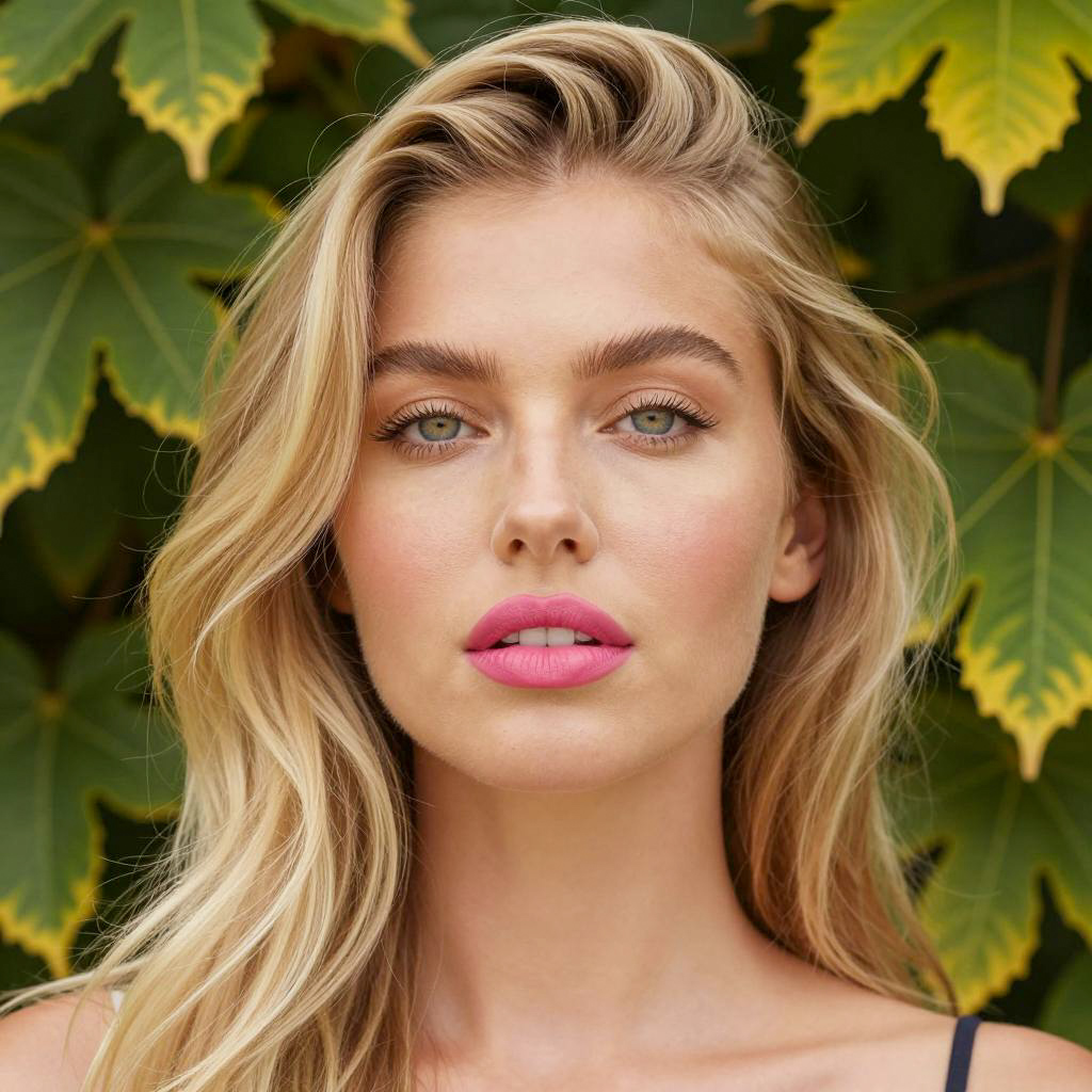 Photograph of a blonde woman with wavy hair, light green eyes, and full pink lips. She has light skin and wears makeup with defined eyebrows and long eyelashes. She looks slightly upward with a neutral expression. Background has green and yellow leaves. She is centered in the frame, with her head tilted slightly to the left.