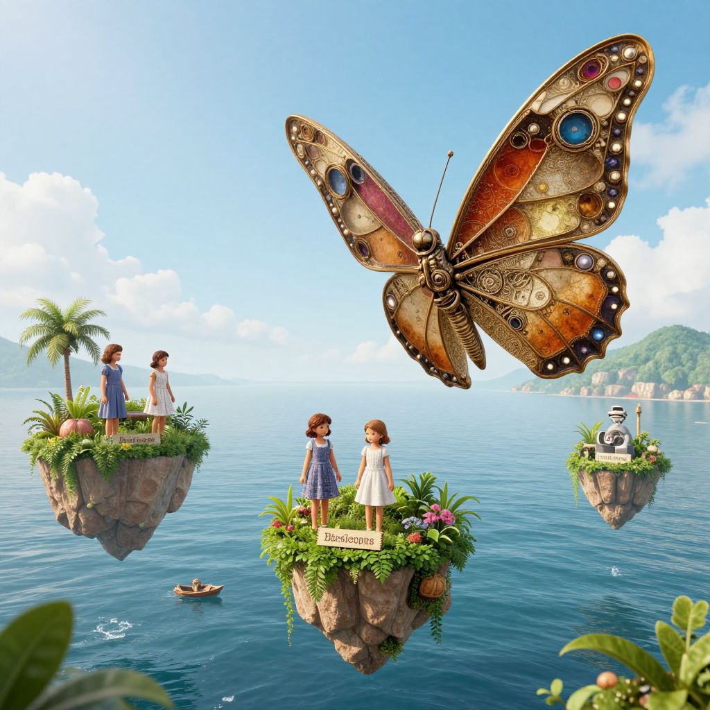 Giant, clockwork butterflies soar gracefully above a tranquil sea, carrying three children across floating islands brimming with lush greenery and self-contained ecosystems, each named after forgotten philosophers.